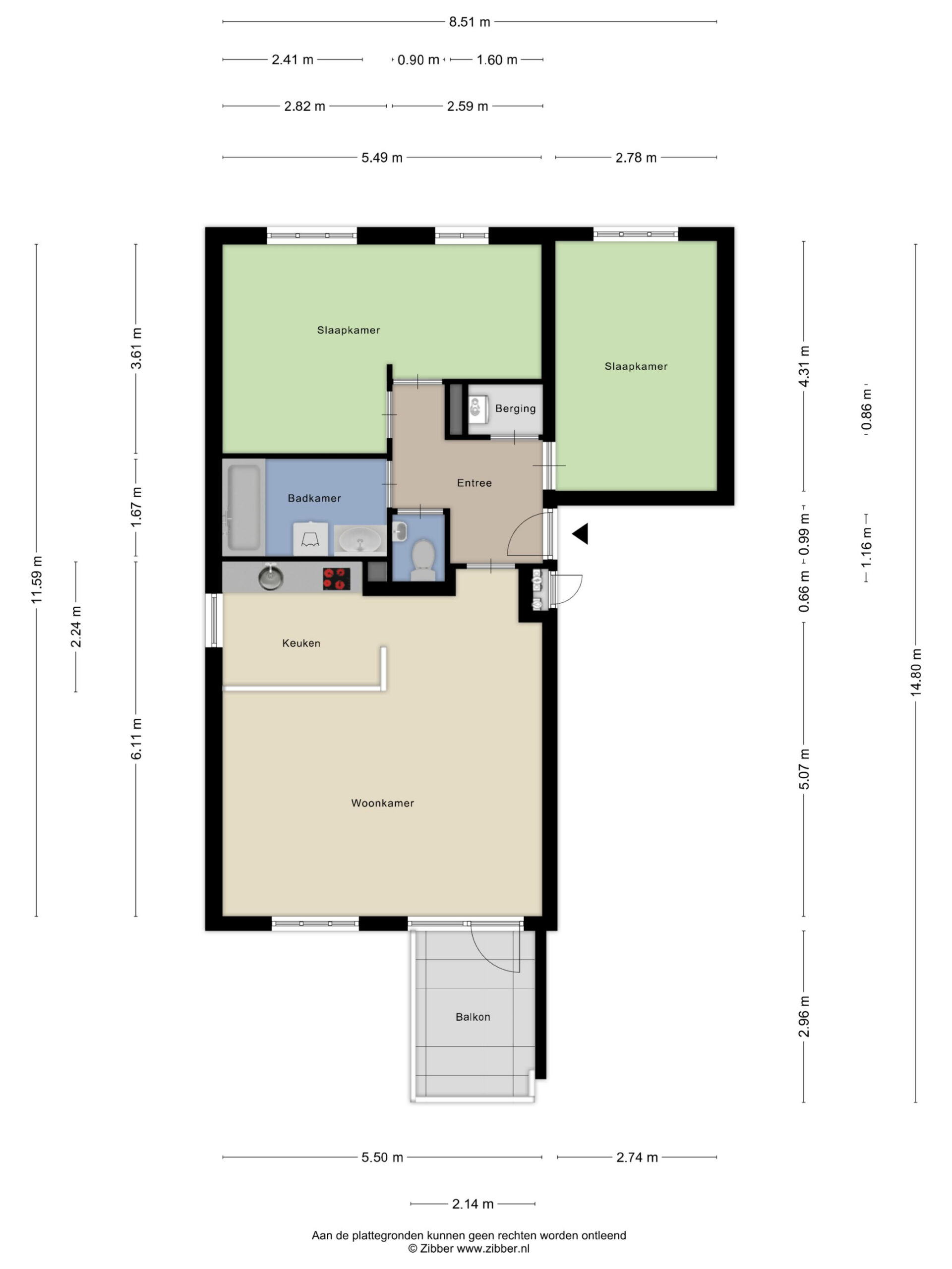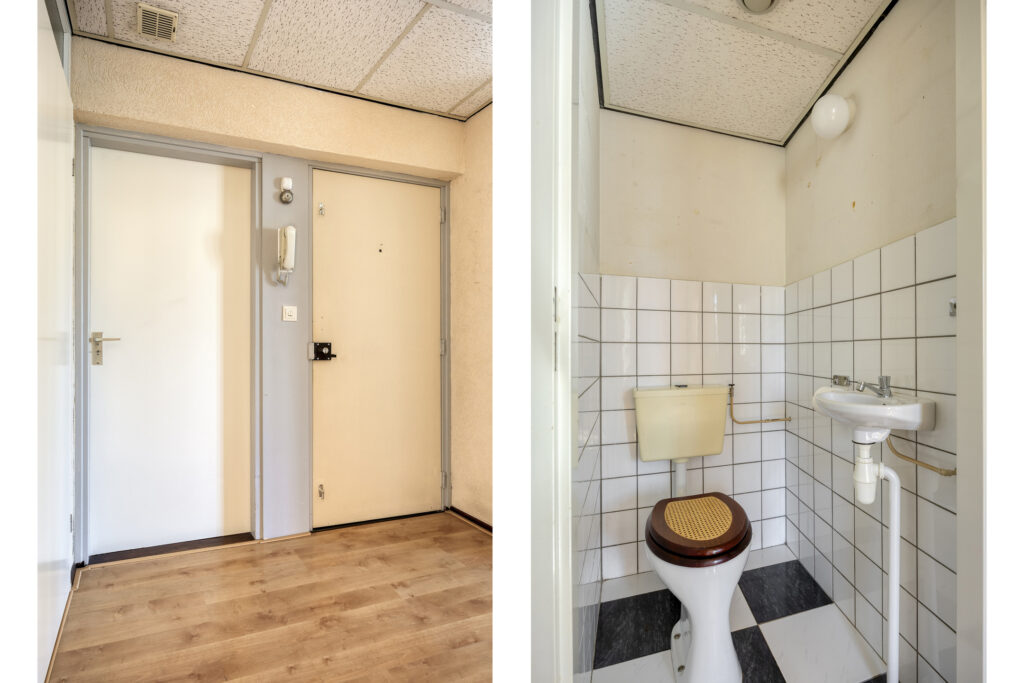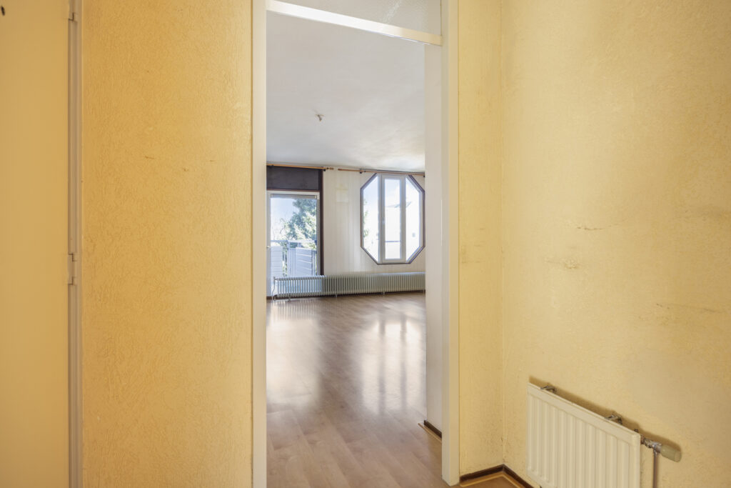 Vanuit de hal heeft u toegang tot de woonkamer met open keuken, 2 slaapkamers, de badkamer, het toilet en een bergkast met CV opstelling.