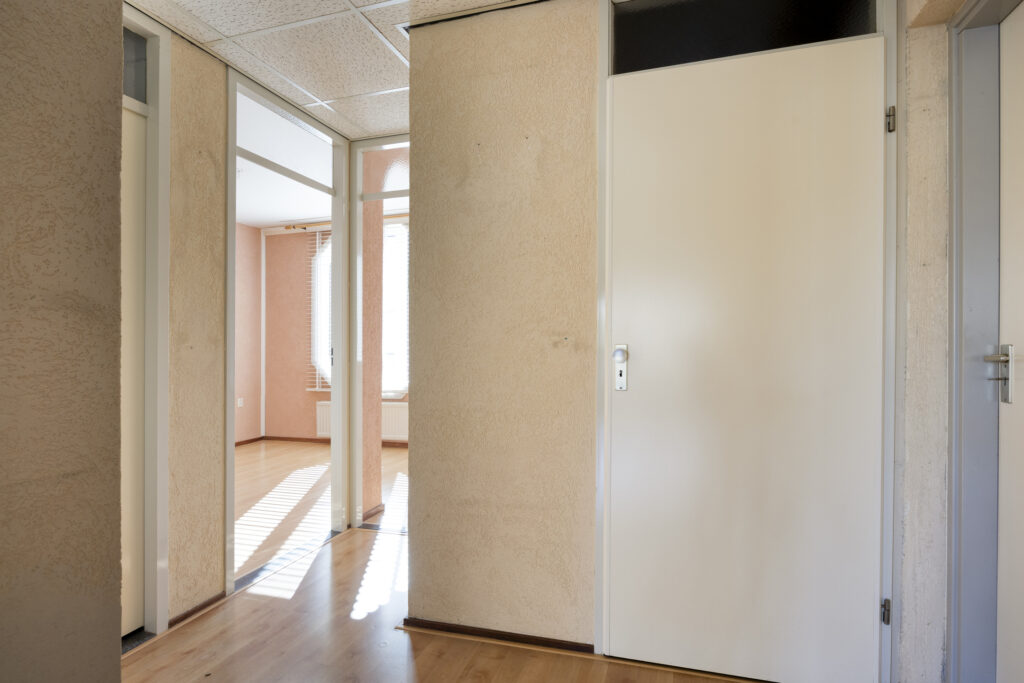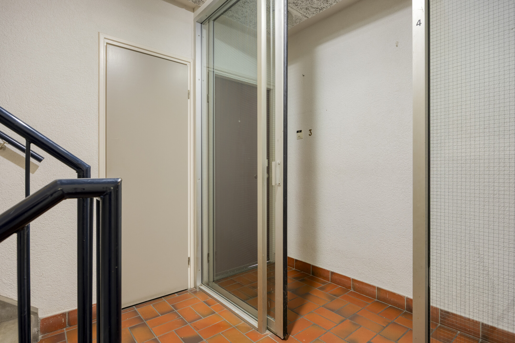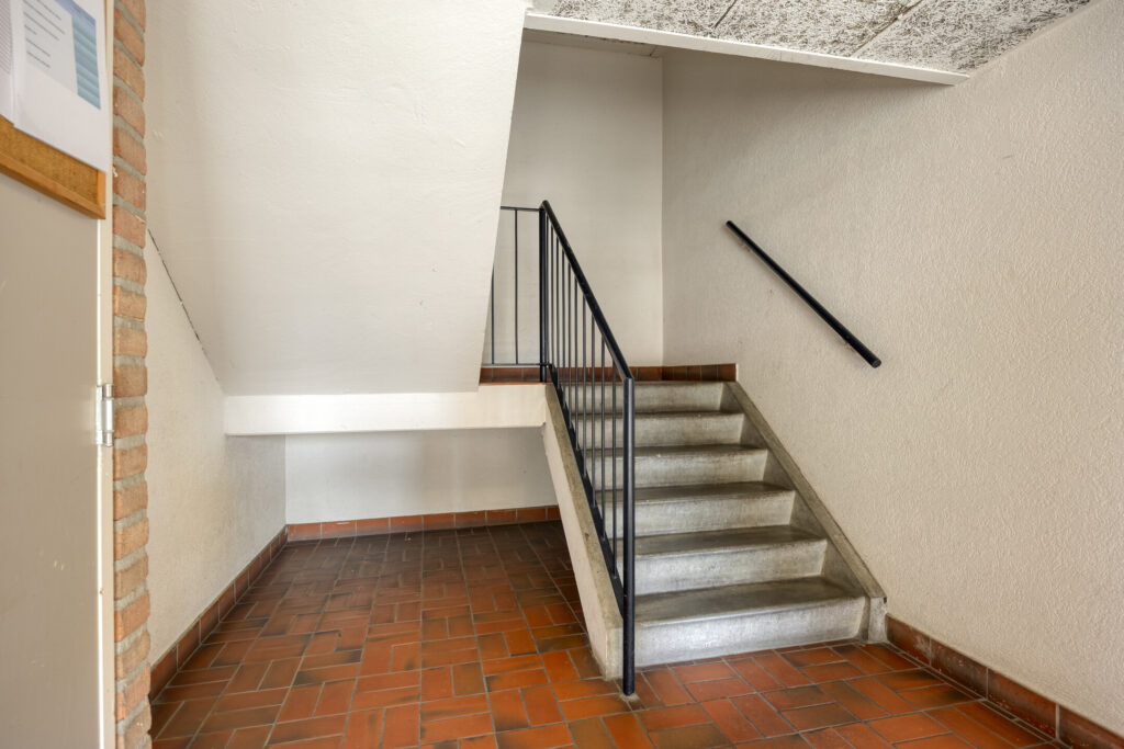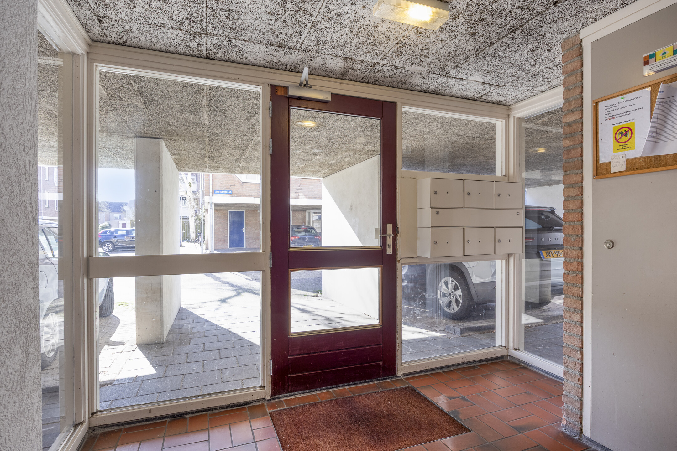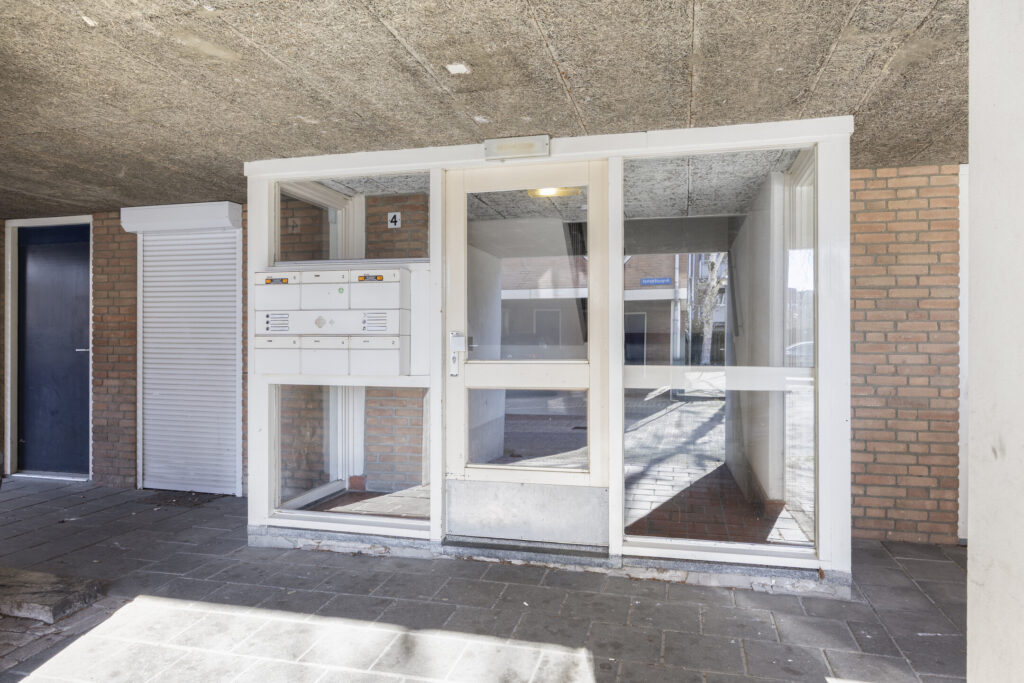 De centrale entree met brievenbussen en intercominstallatie bied toegang tot de centrale hal met het trappenhuis.