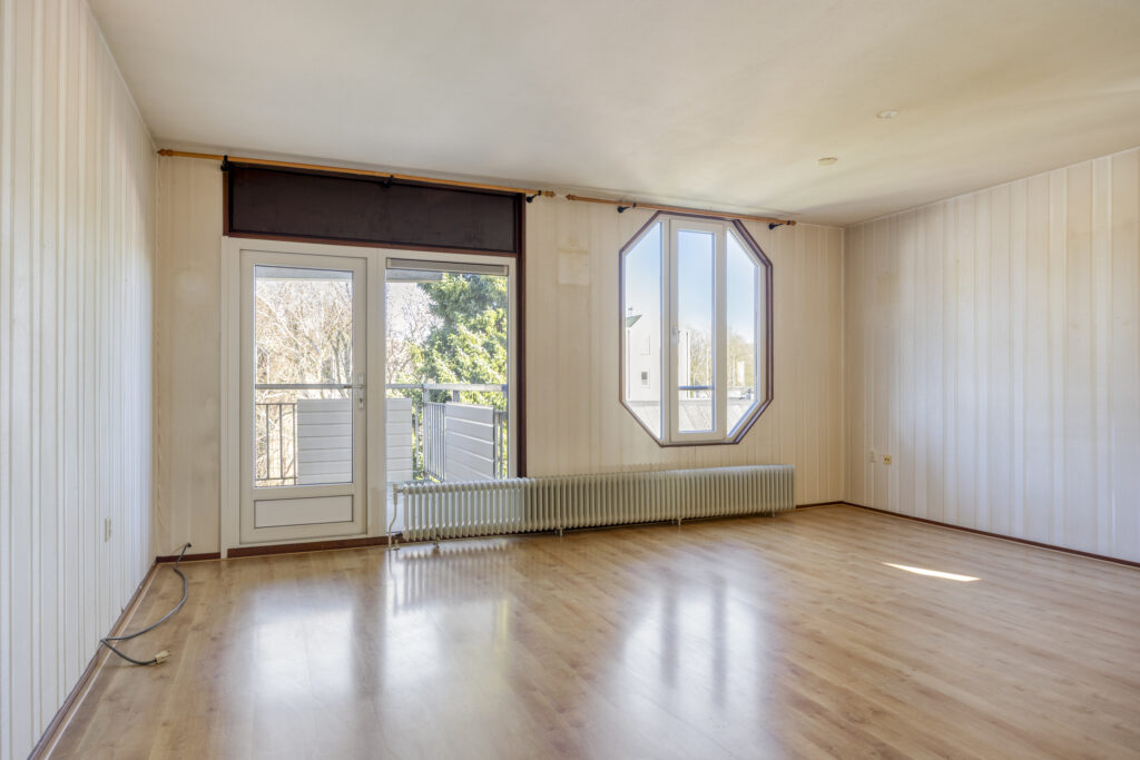 Riante, sfeervolle, woonkamer met veel lichtinval. De woonkamer staat in verbinding met de open keuken. Vanuit de woonkamer is het balkon toegankelijk.