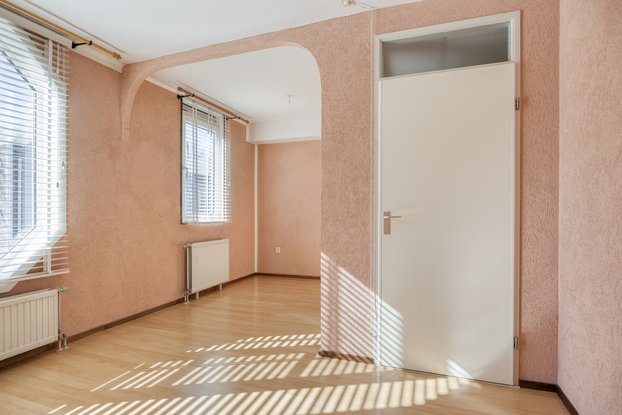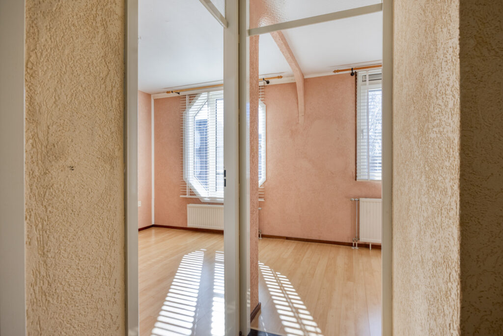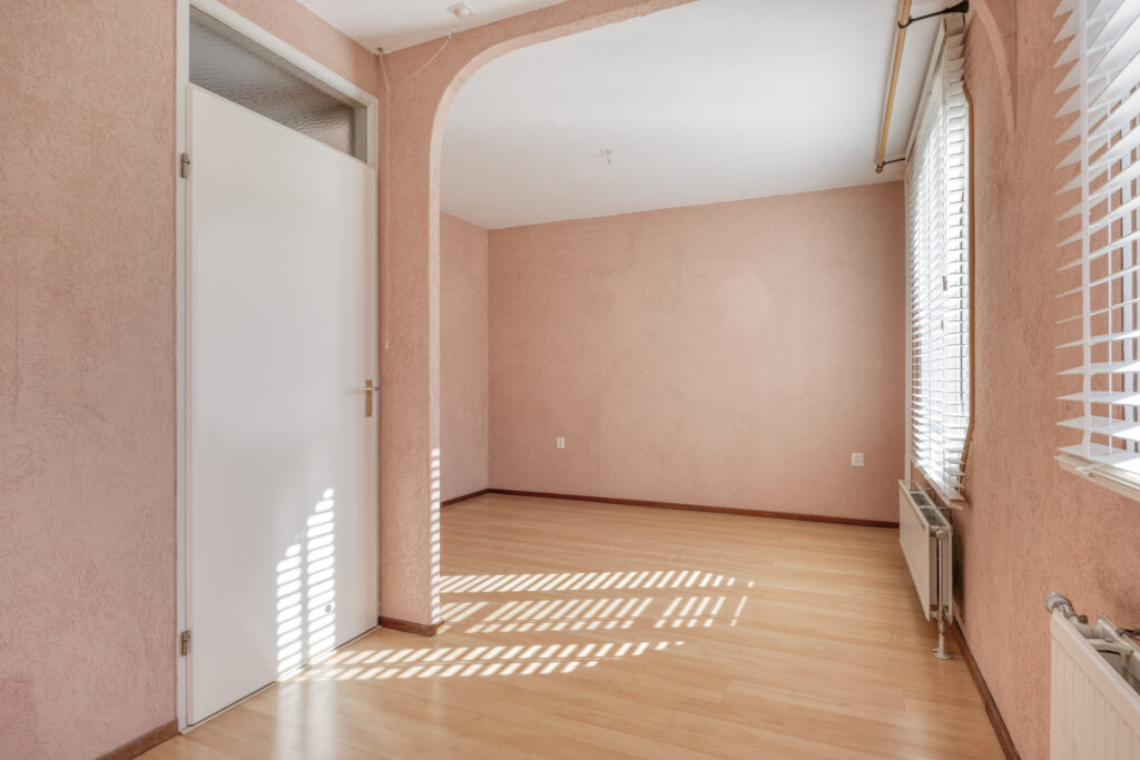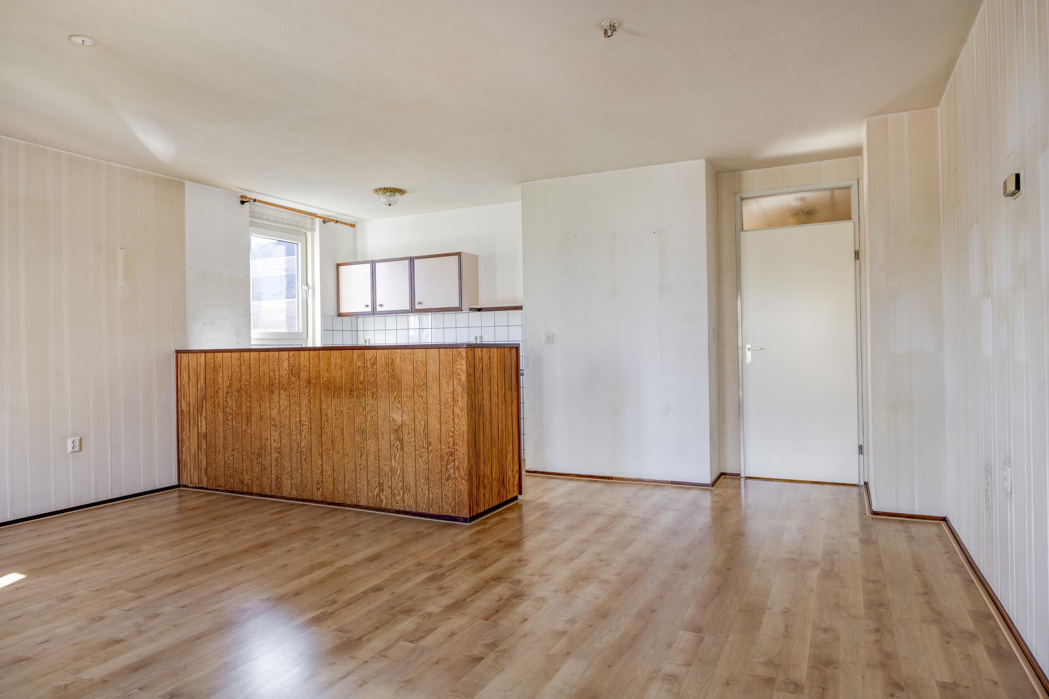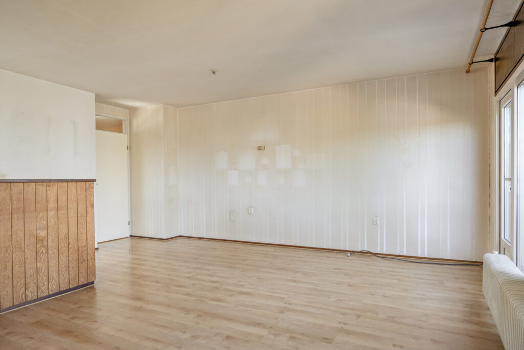 De woonkamer is afgewerkt met een laminaatvloer en behangen wanden.