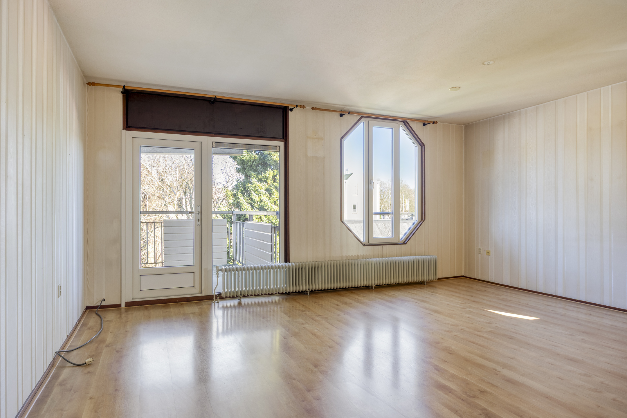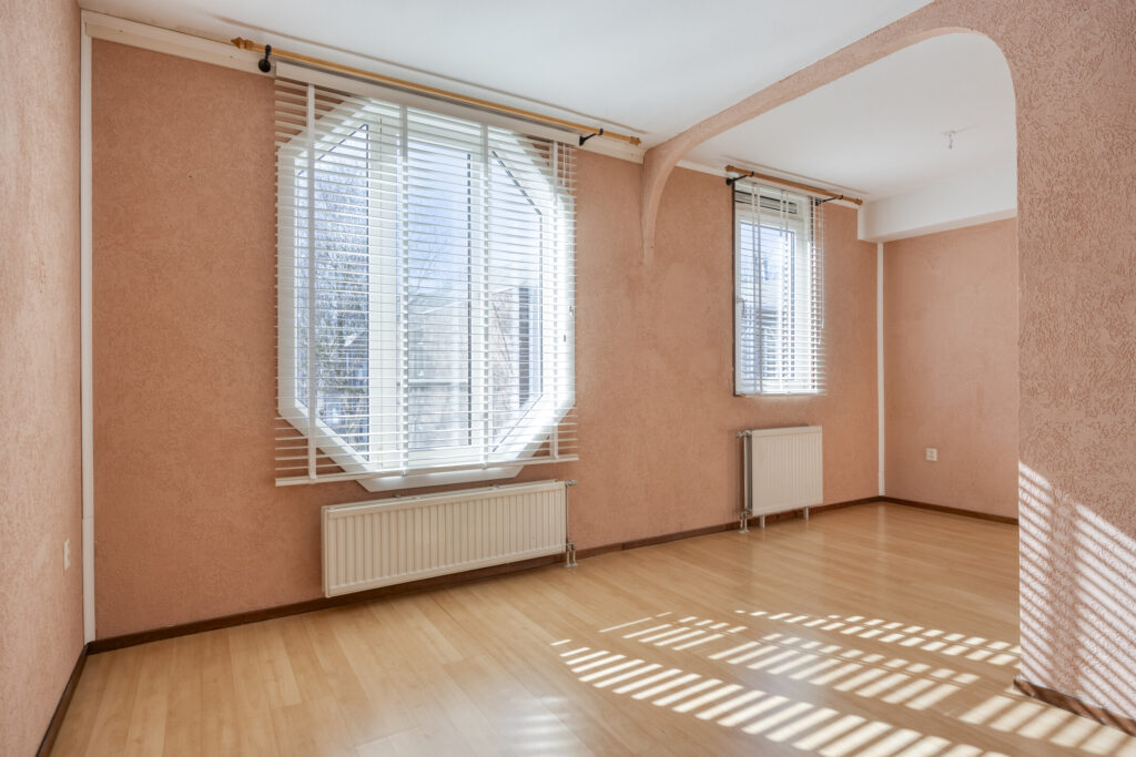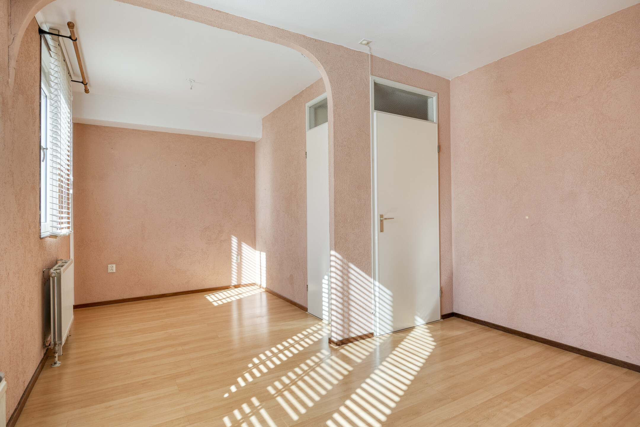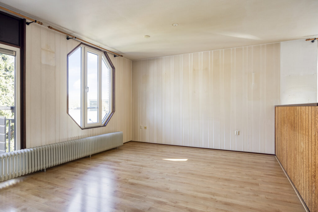 De woonkamer is afgewerkt met een laminaatvloer en behangen wanden.