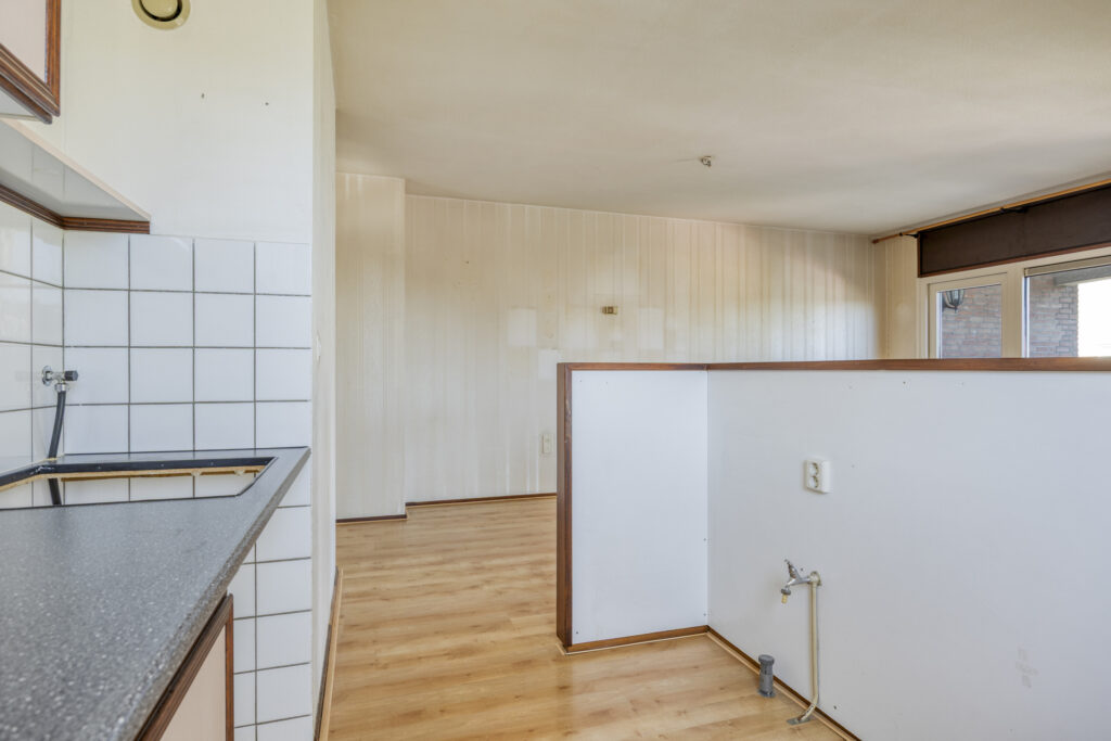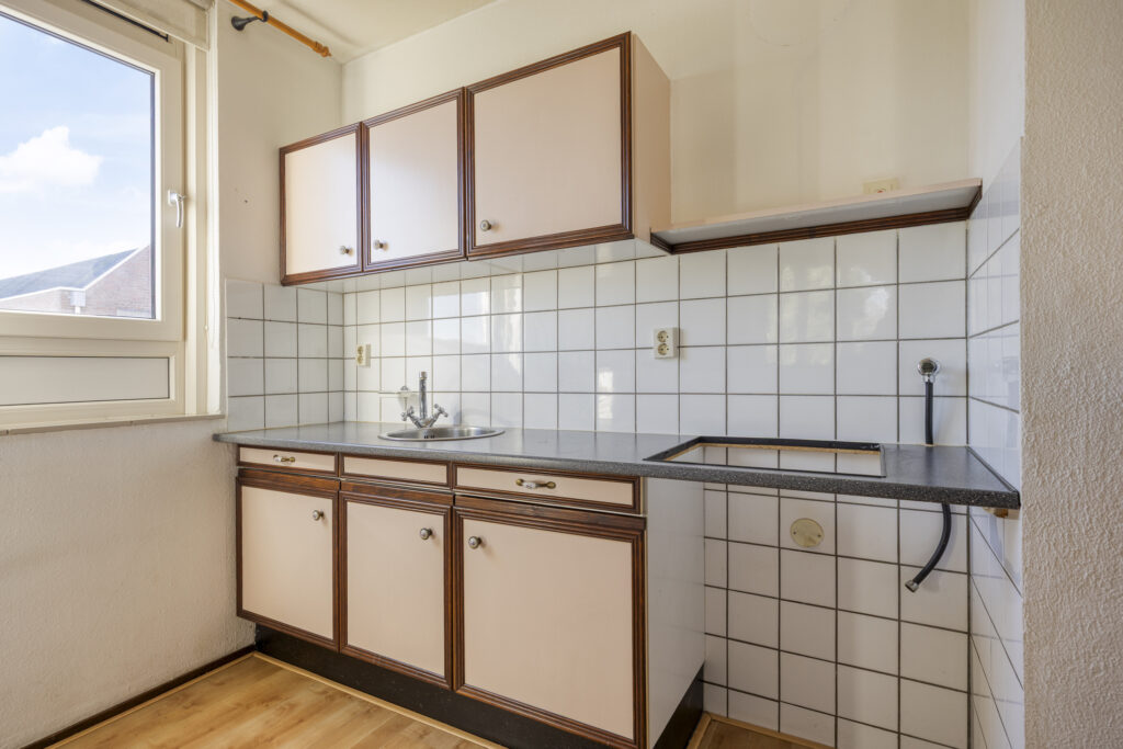 De open keuken is voorzien van een eenvoudig keukenblok in wandopstelling en wordt middels een bar afgescheiden van de woonkamer. Er is een vaatwasser aansluiting beschikbaar.