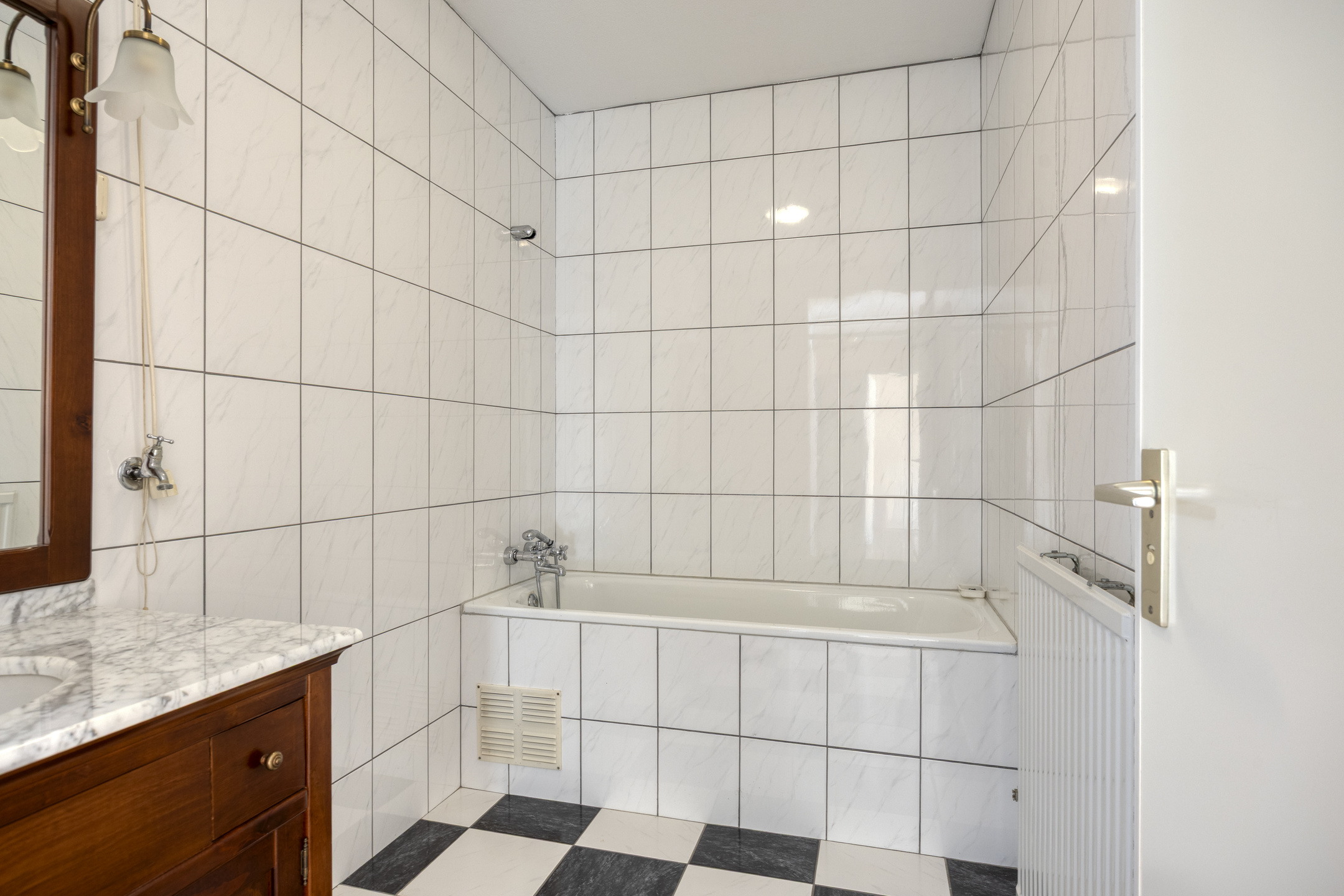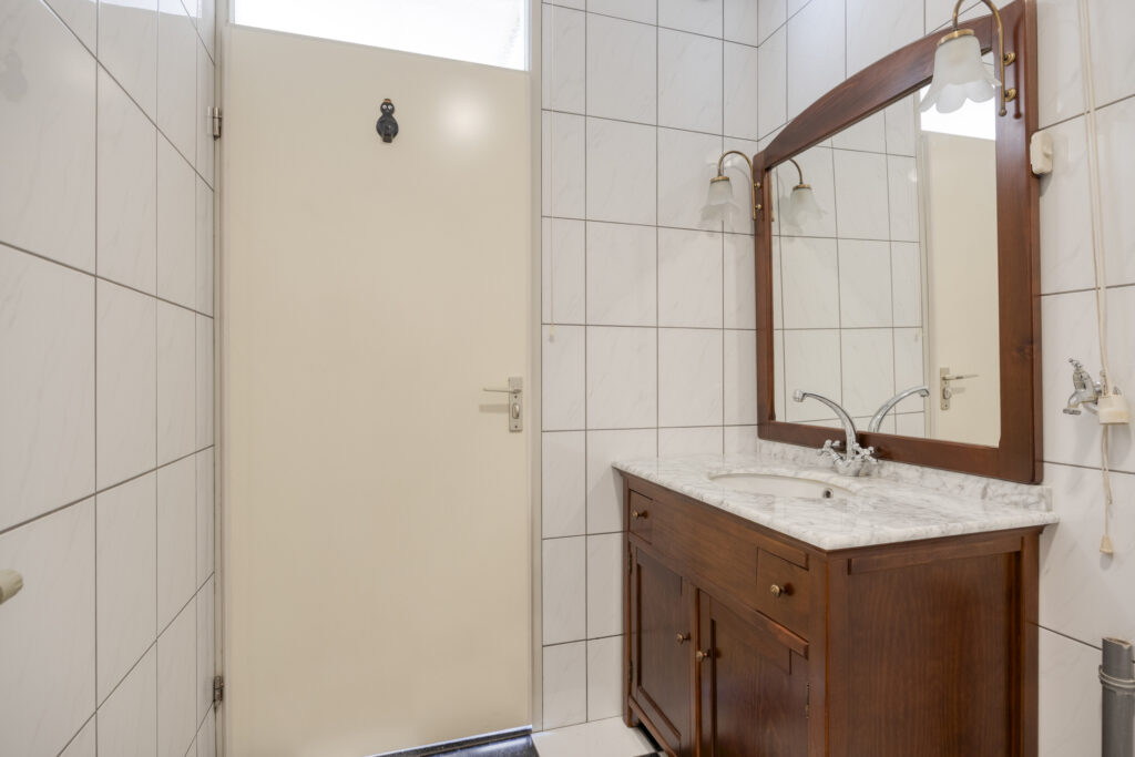 De lichte badkamer is geheel betegeld en beschikt over een wastafelmeubel, ligbad-douche combinatie en een aansluiting voor de wasmachine.