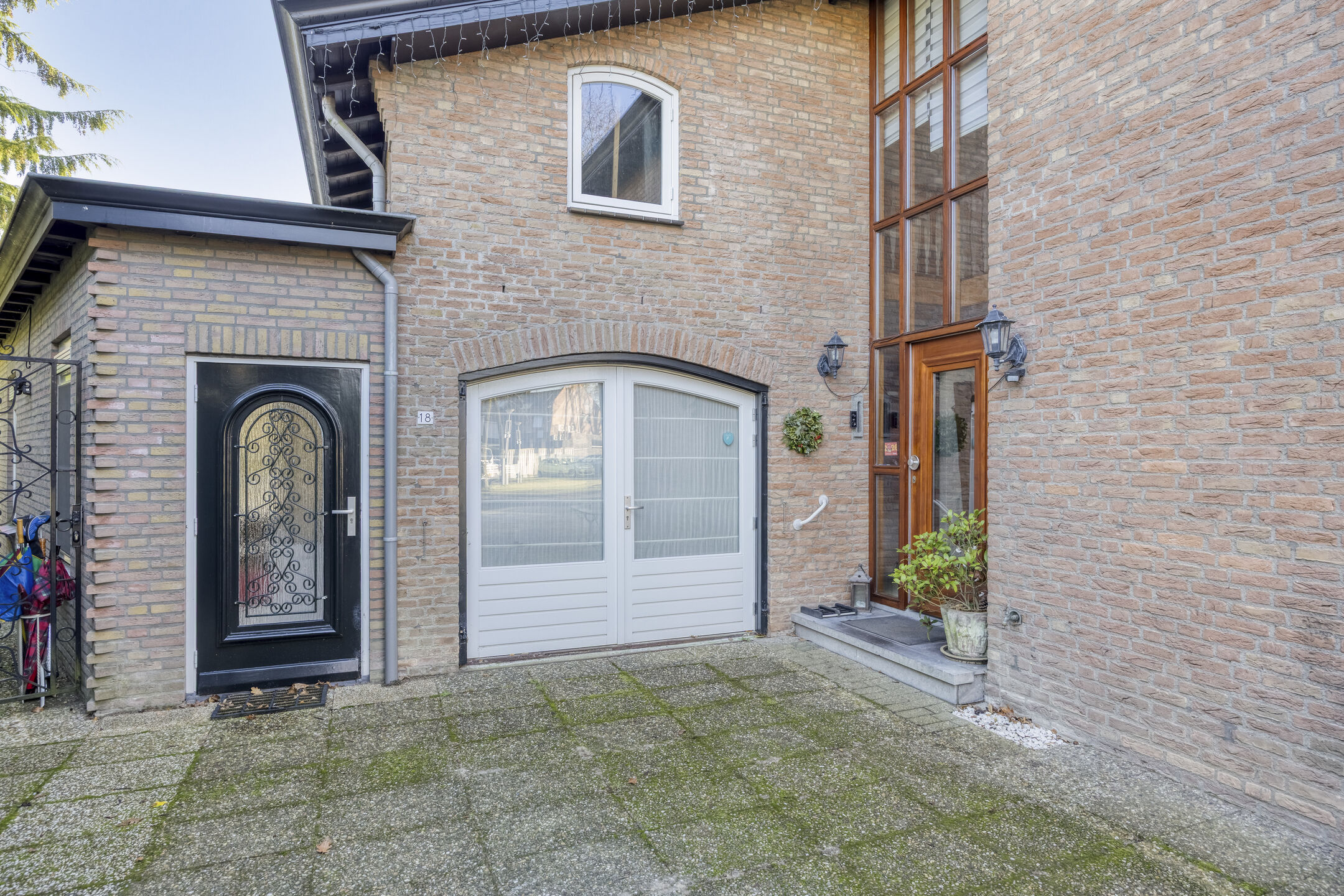 De voortuin is netjes aangelegd en beschikt over een ruime oprit. Aan beide zijden van de woning zijn afsluitbare poorten (siersmeedwerk) naar de achtertuin.