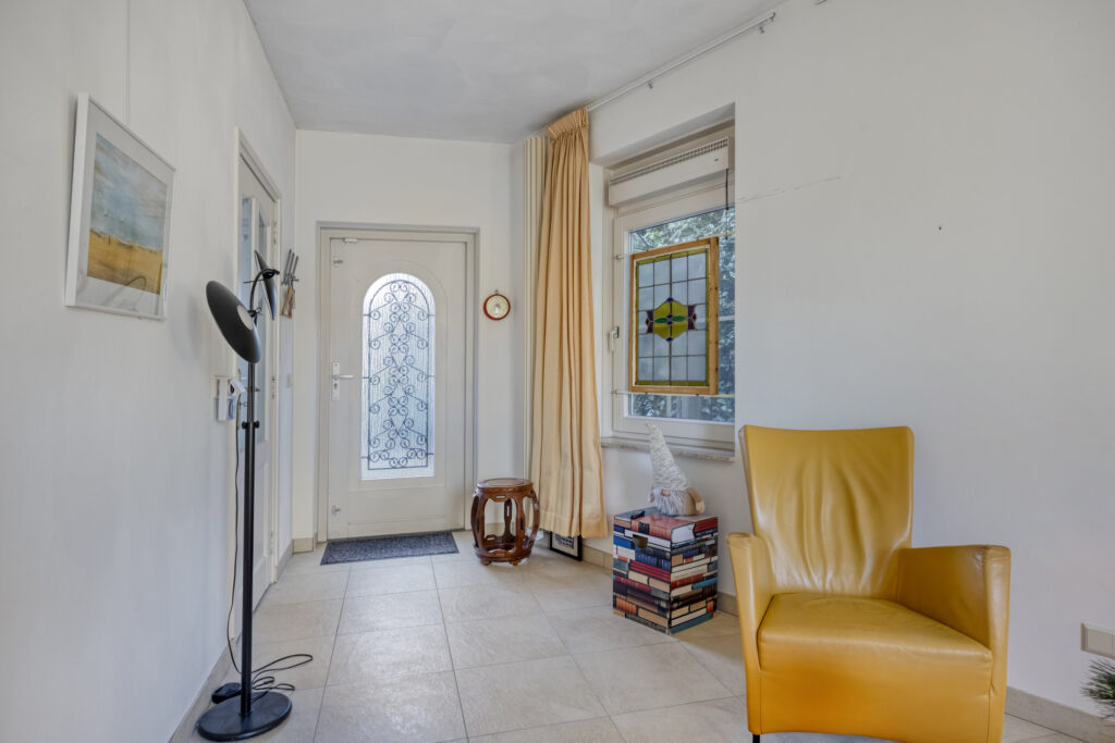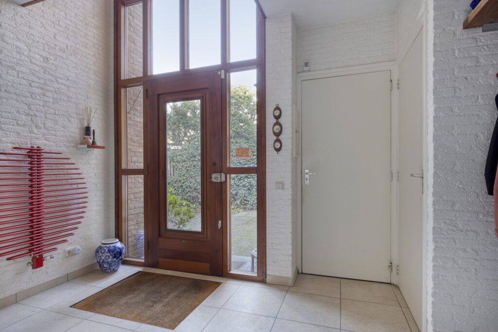 Via de ruime oprit (3 auto’s) bereikt u de entree. De hal is voorzien van een tegelvloer, garderobe, designradiator en trapopgang naar de eerste verdieping. Vanuit de hal heeft u toegang tot de woonkamer, toiletruimte en de praktijk-/kantoorruimte. De glazen binnendeur zorgt voor een prettige lichtinval in de woonkamer.