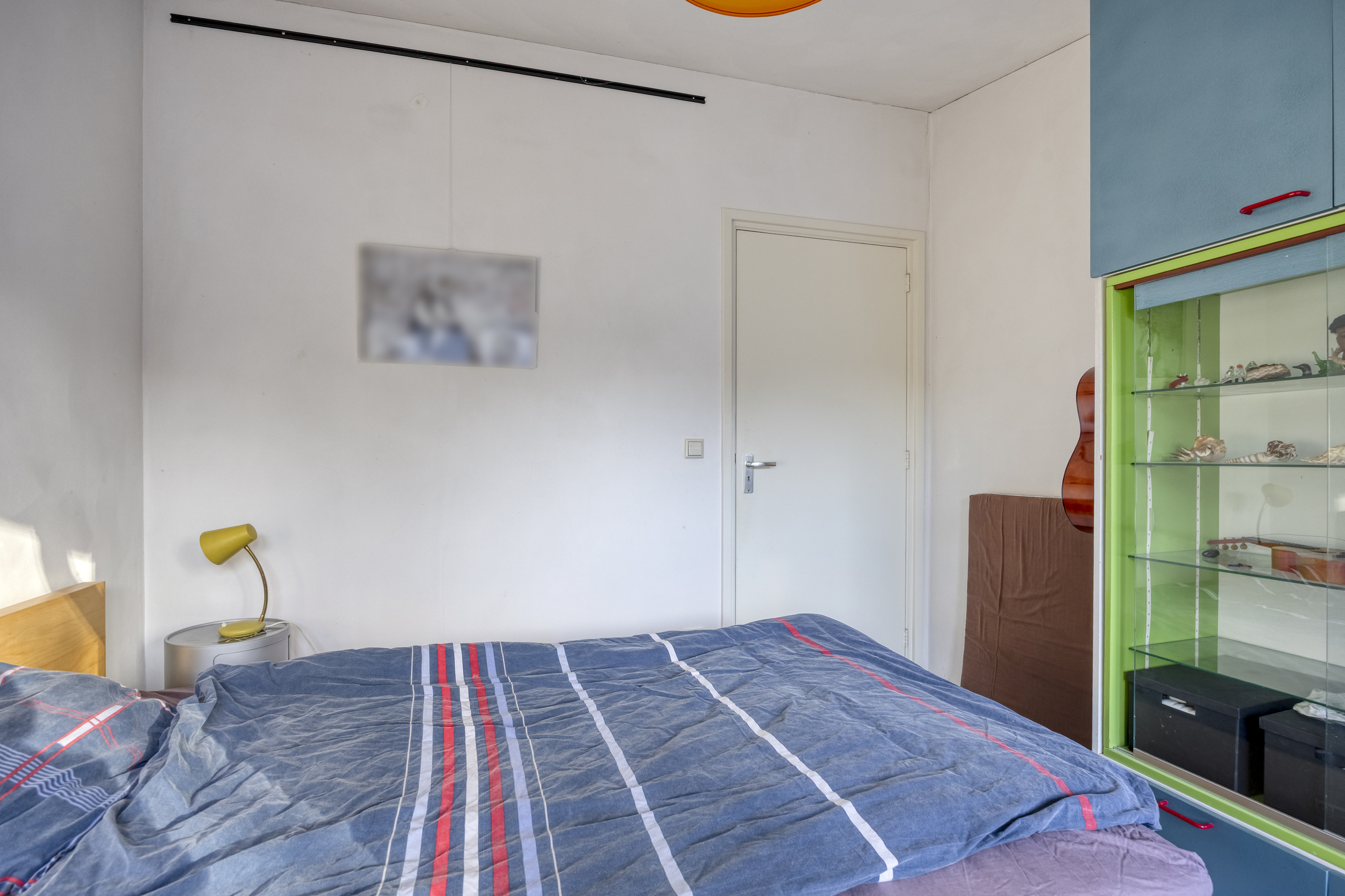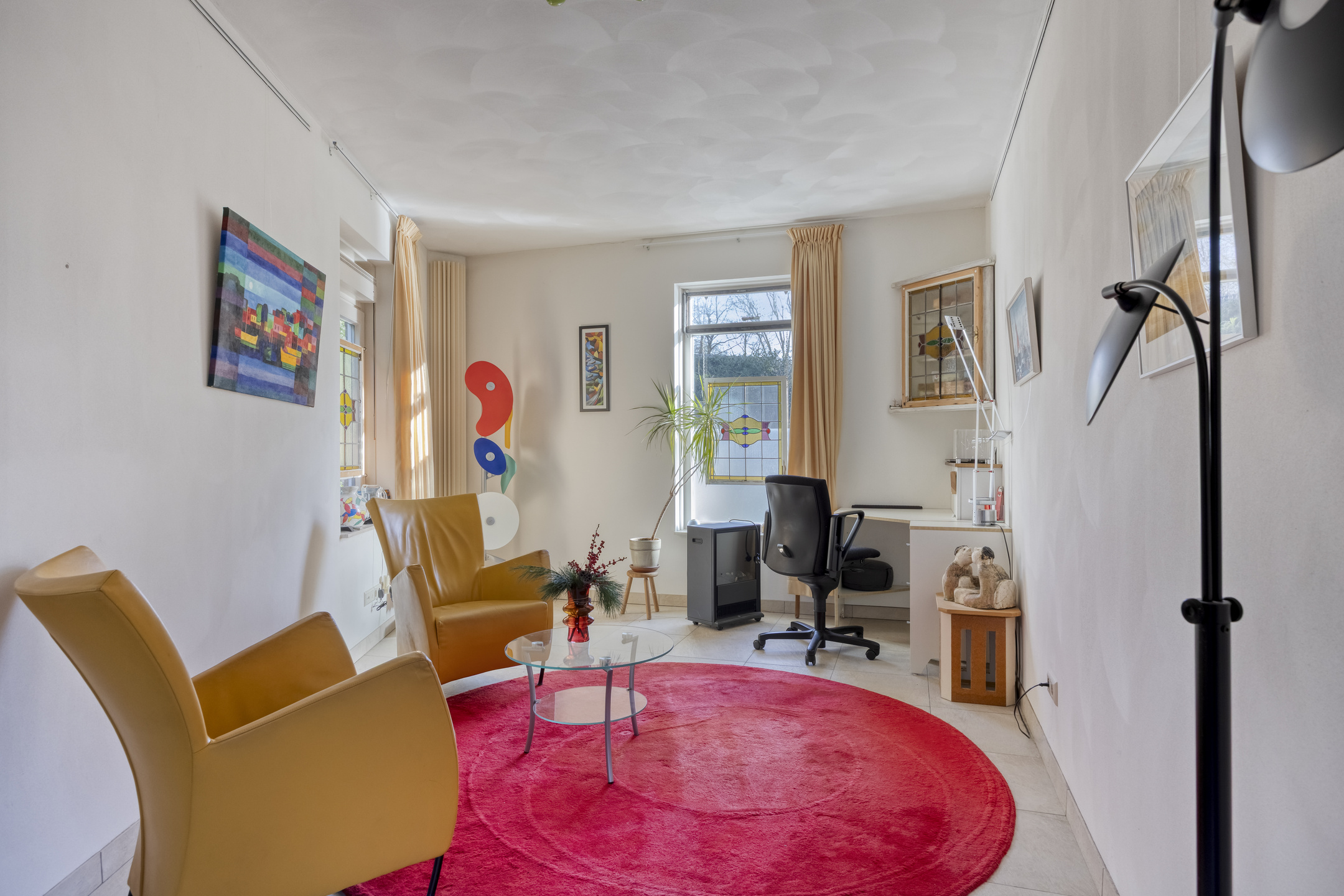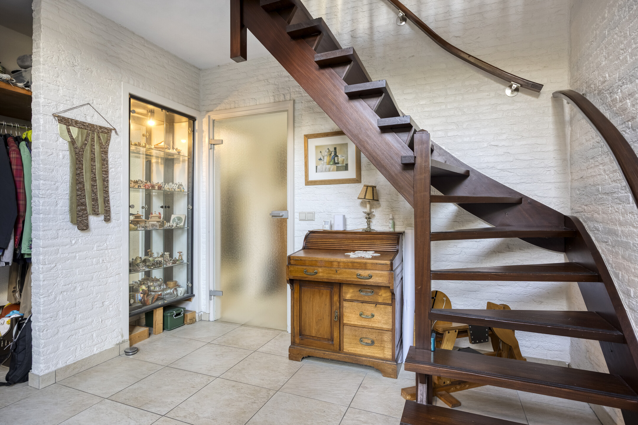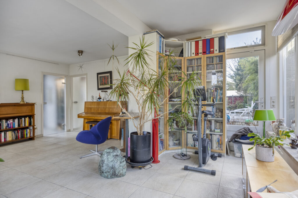Praktische kamer met tegelvloer, stucwerk wanden en plafond, eveneens voorzien van een eigen toegangsdeur. Ideaal voor werk aan huis.