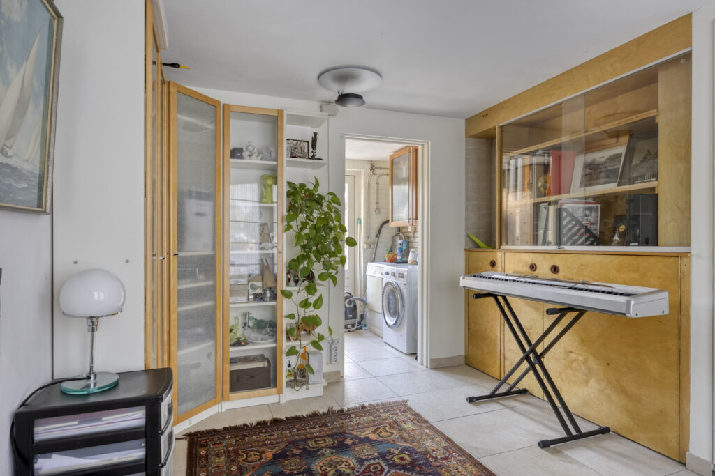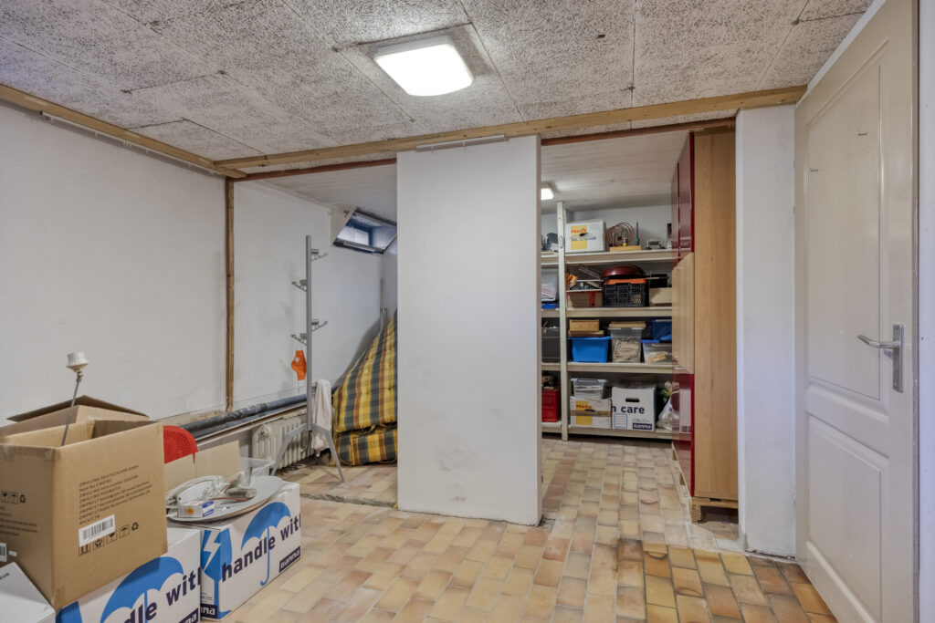 Deze ruimte heeft een tegelvloer, stucwerk wanden en plafond, een eigen ingang en een uitgebreide meterkast.