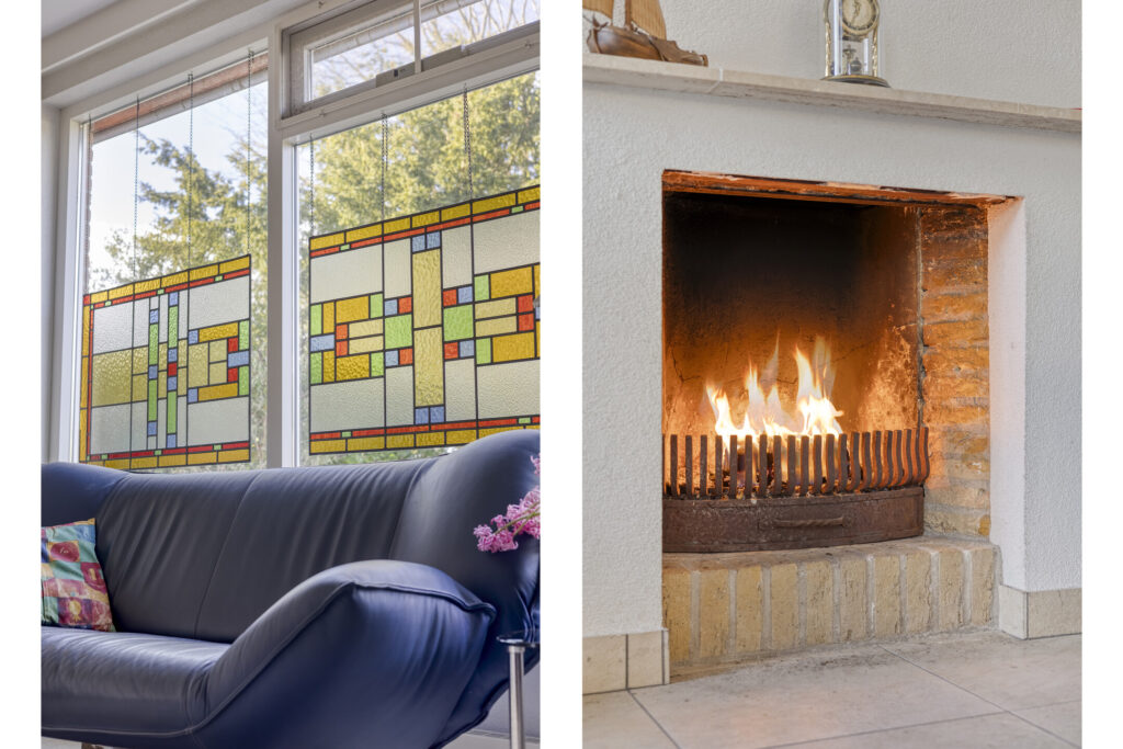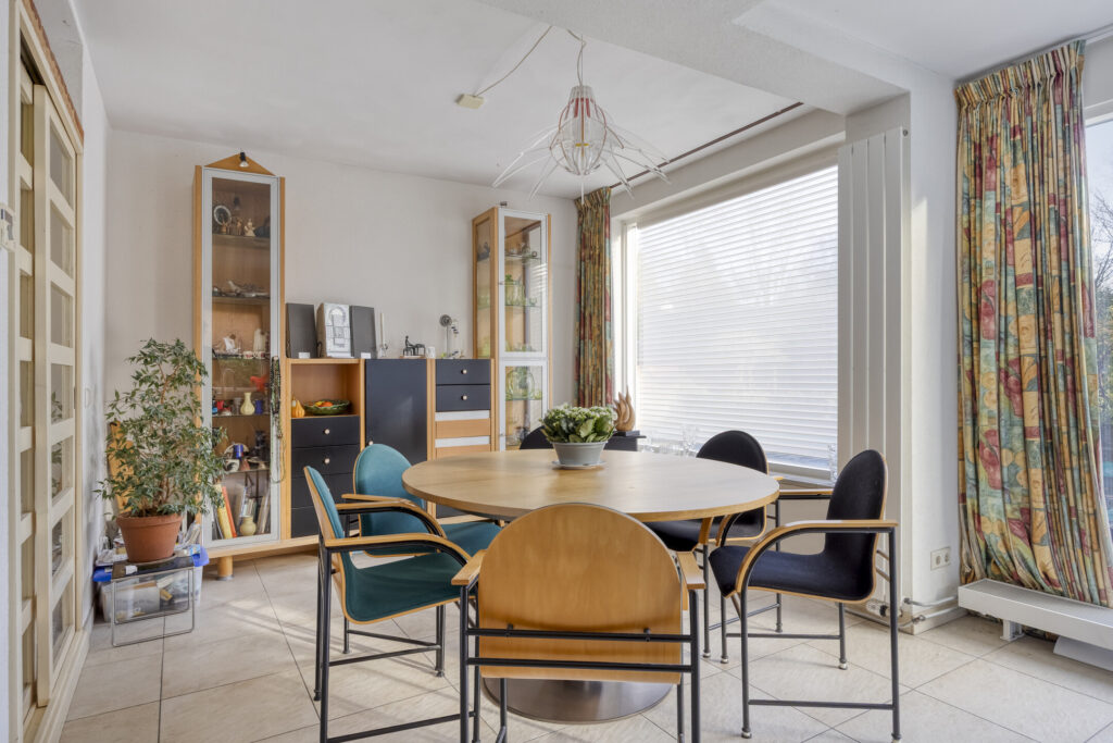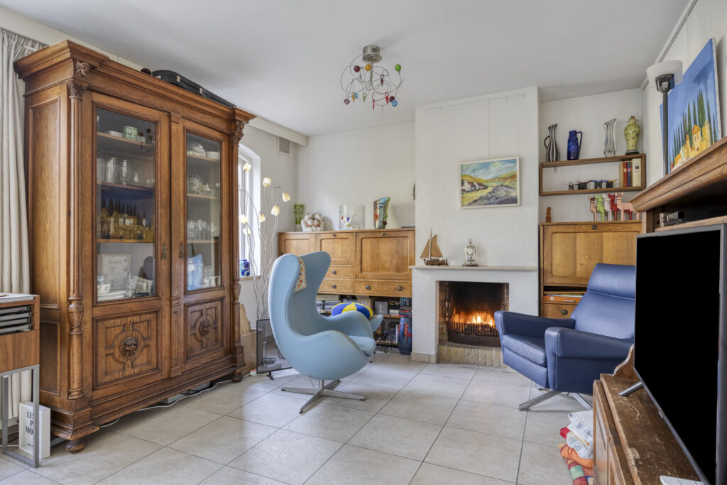 Riante, uitgebouwde woonkamer met veel daglicht. De ruimte beschikt over een tegelvloer en een sfeervolle open haard. De wanden zijn afgewerkt met spachtelputz en het plafond is strak gestuct. Via een glazen deur bereikt u de eetkeuken.