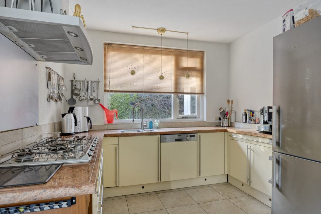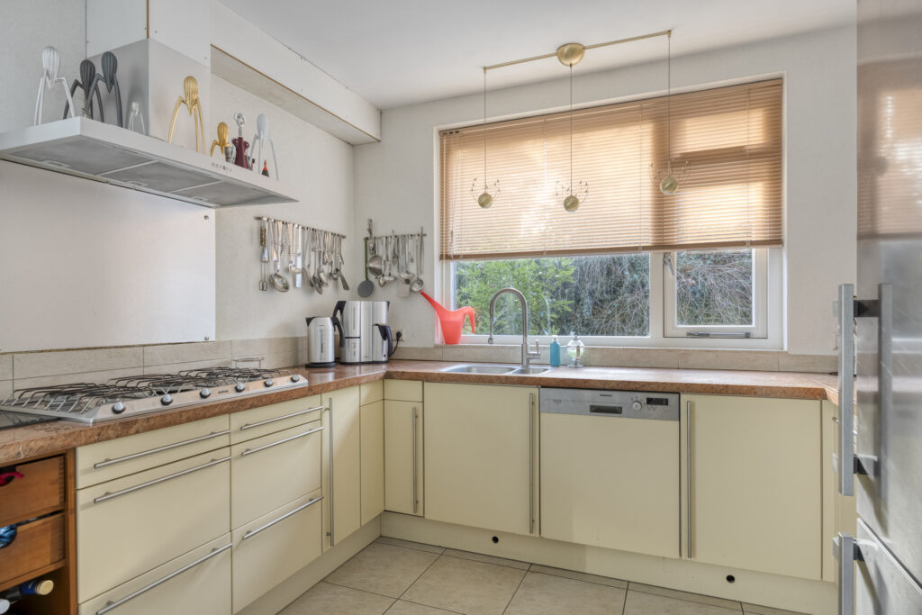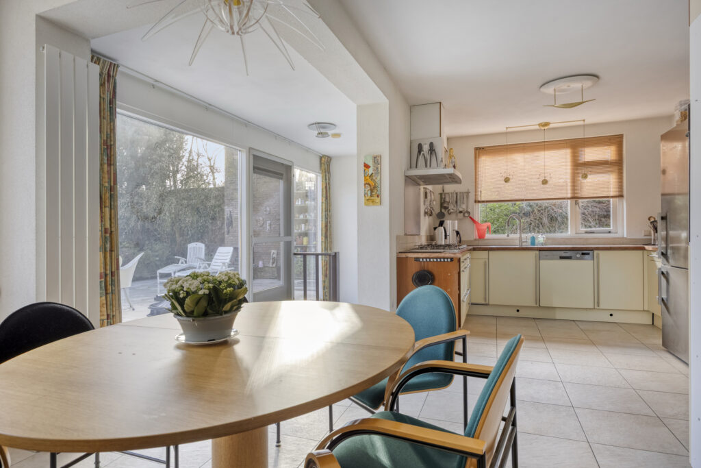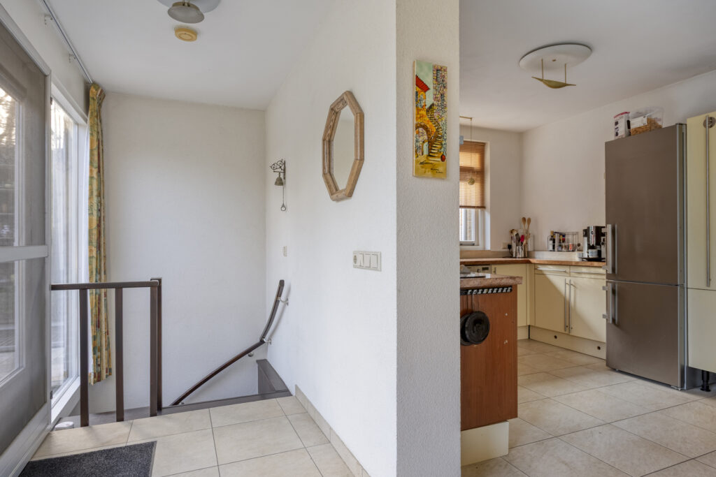 Royale, dichte eetkeuken met tegelvloer en uitzicht op de achtertuin met terras en zwembad. Uitgerust met een U-opstelling en o.a. een 5-pits gaskookplaat (SMEG), afzuigkap, granieten werkblad, vaatwasser, close-in boiler, combimagnetron en een losse koel-vriescombinatie (Liebherr, ter overname). Vanuit de keuken is het souterrain toegankelijk.