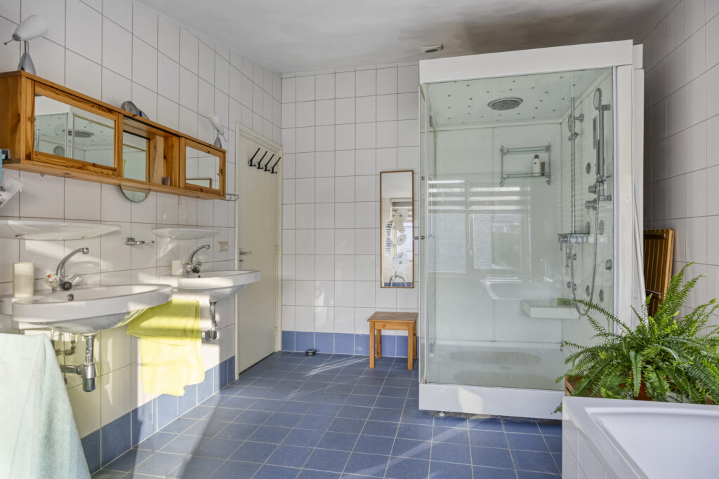 Geheel betegelde badkamer met douchecabine, ligbad, dubbele wastafel en twee designradiatoren.