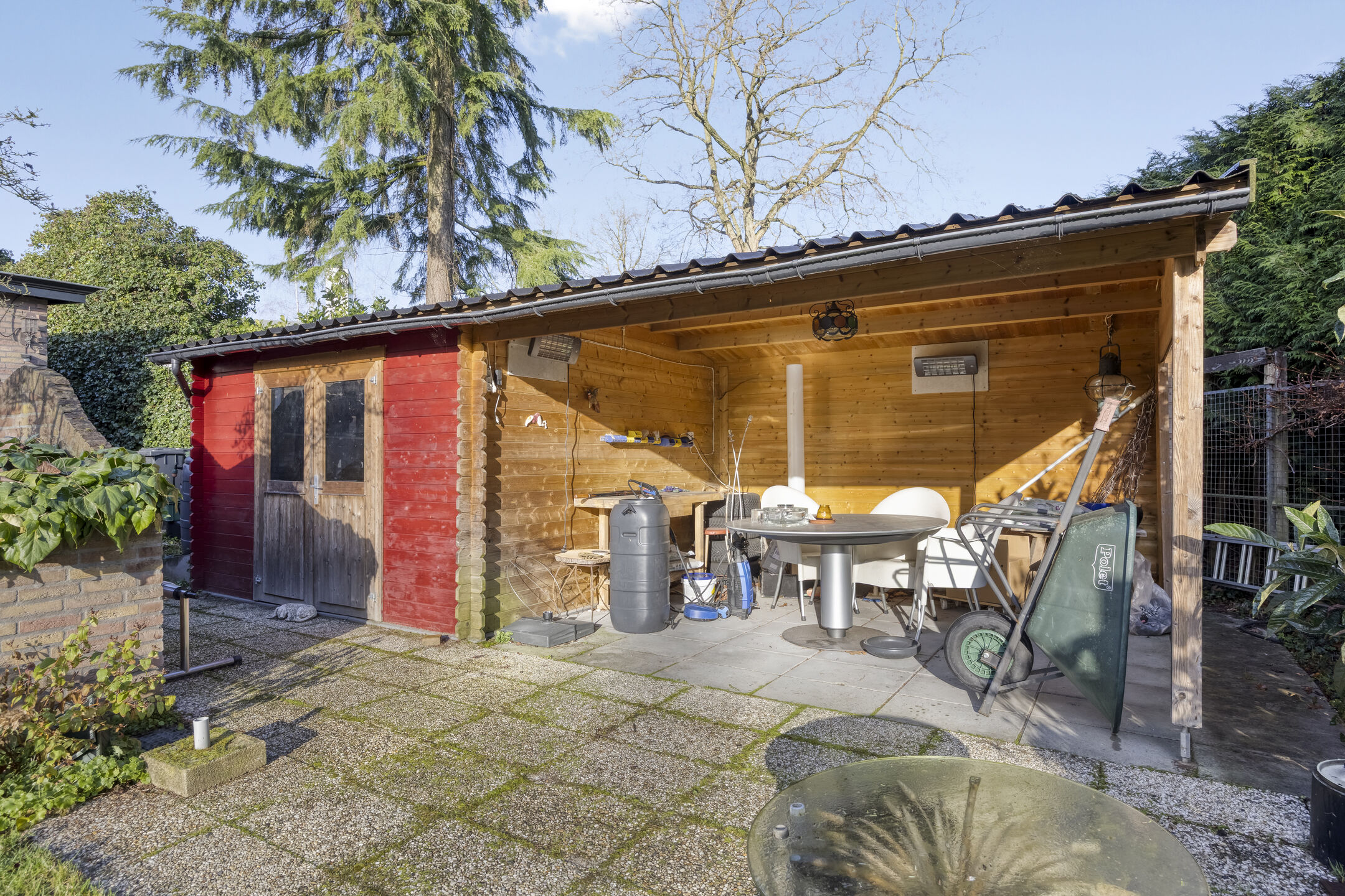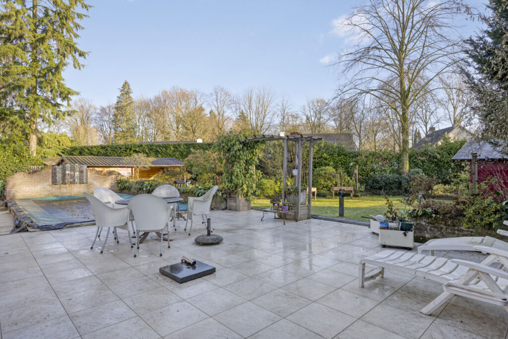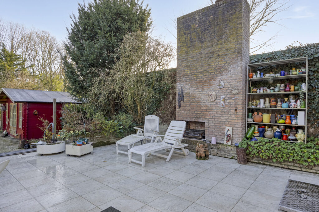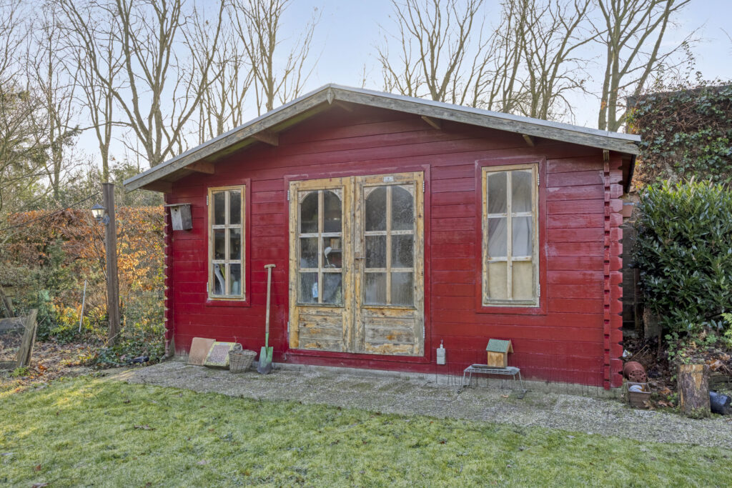 De privacy biedende achtertuin op het zuid-oosten is volledig omheind en aangelegd met sierbestrating, beplanting en gazon. Direct achter de woning ligt een royaal terras met open haard en het verwarmde zwembad. Het zwembad (4 × 8 x 1,5 m) is in 2024 gerenoveerd en wordt verwarmd via solarmatten en is voorzien van filterinstallatie. In de tuin staan een hou-ten tuinhuis en een tuinhuis met veranda.