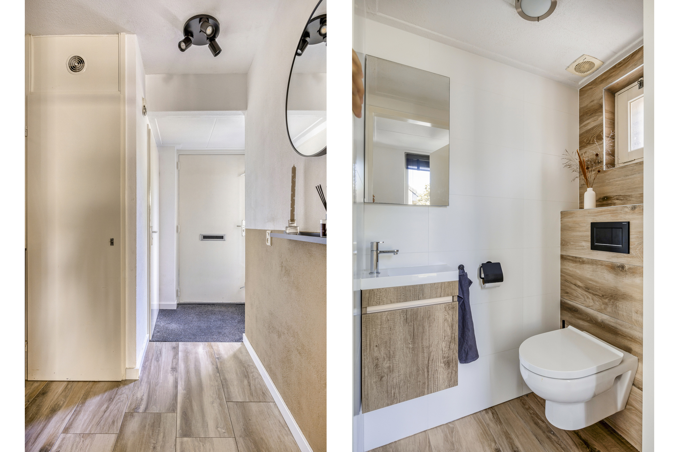 Overdekte entree met toegang tot de ruime hal, voorzien van garderobe, uitgebreide meterkast (3-fase, vernieuwd in 2019), trapopgang en modern toilet (2019) met vrij hangend closet en fonteintje.