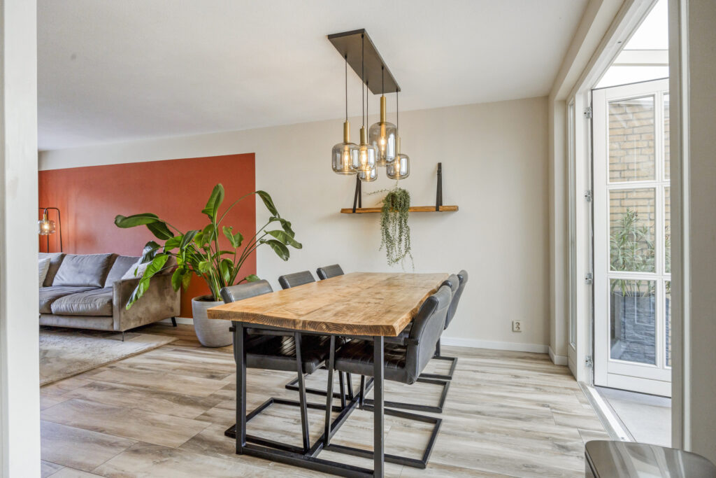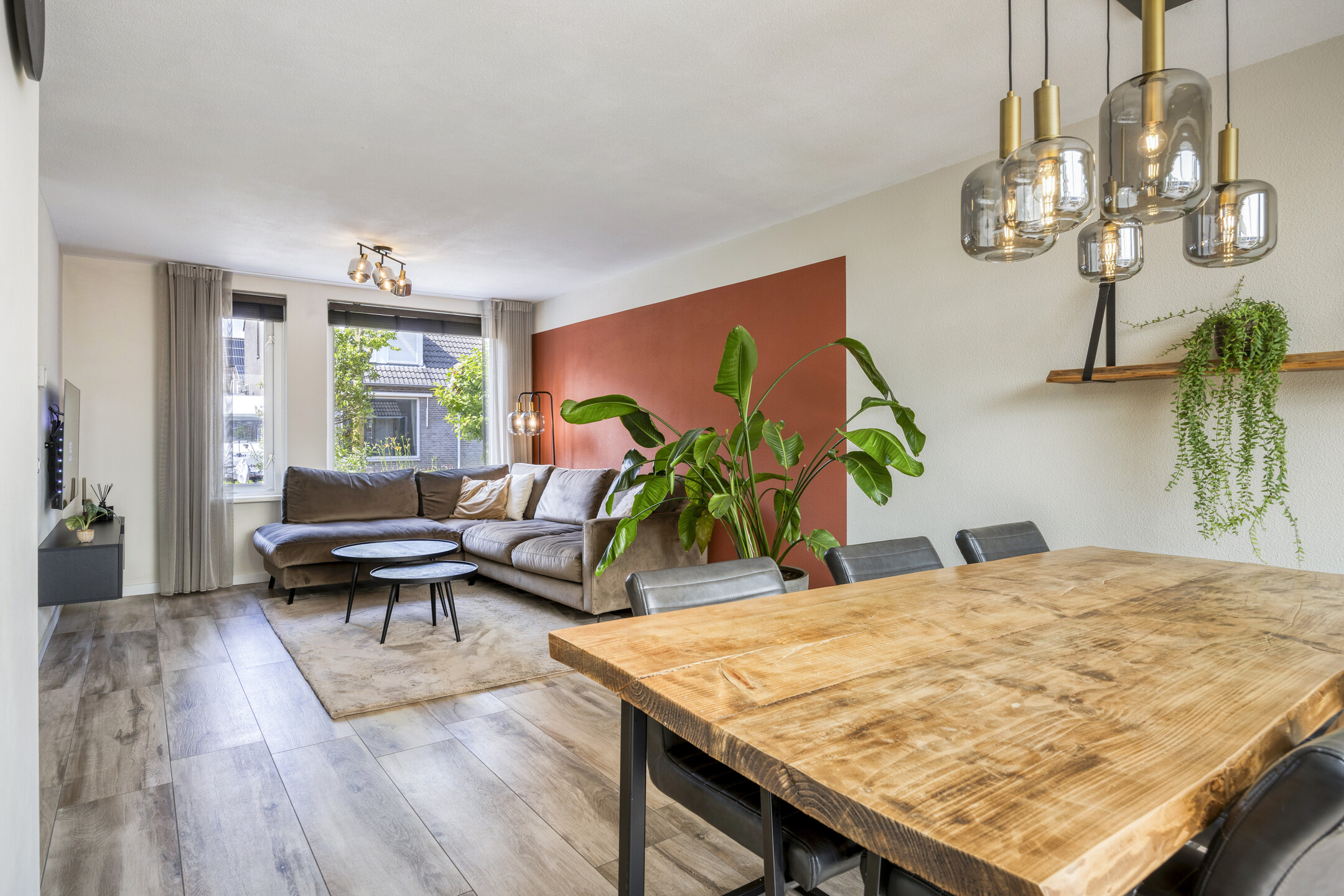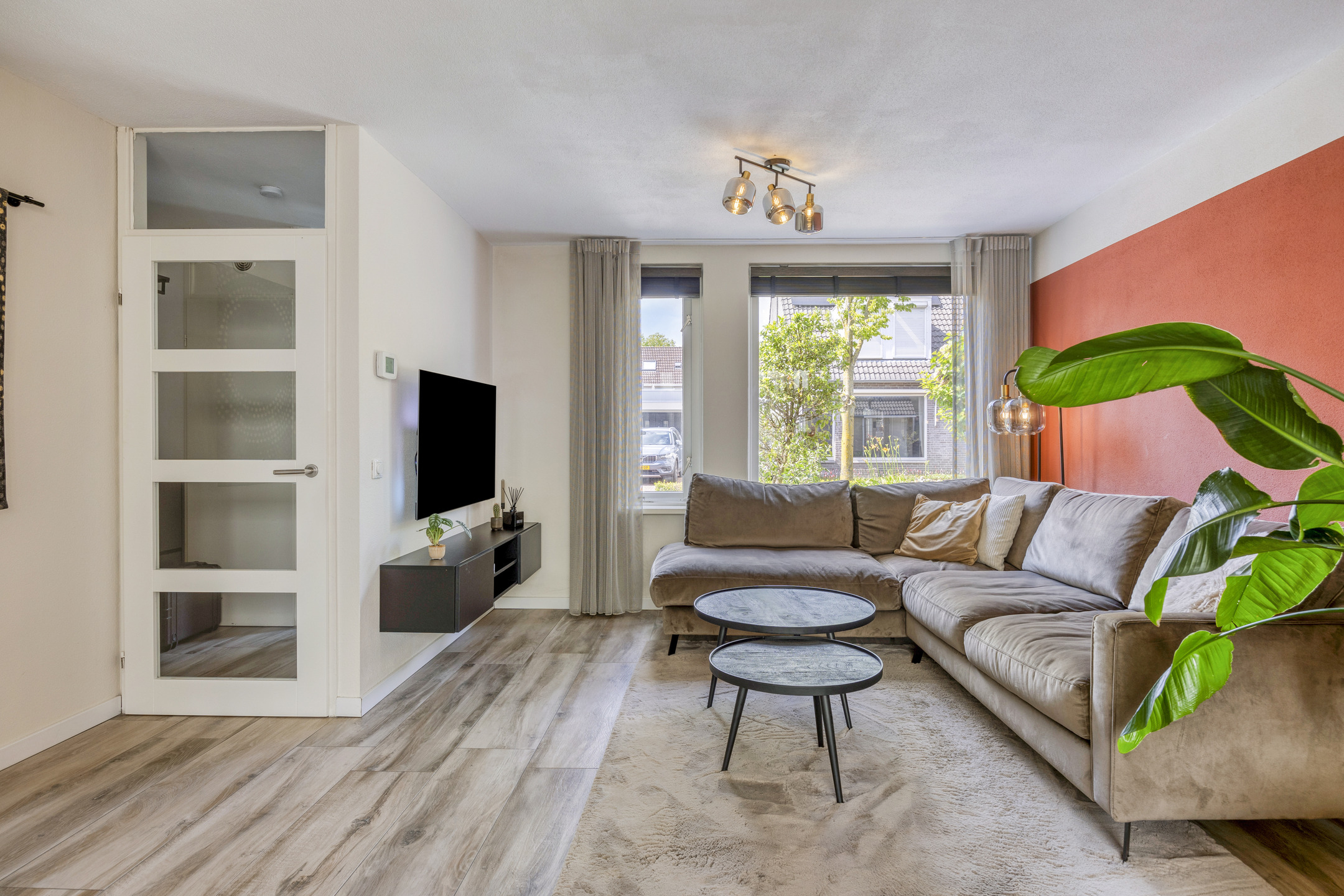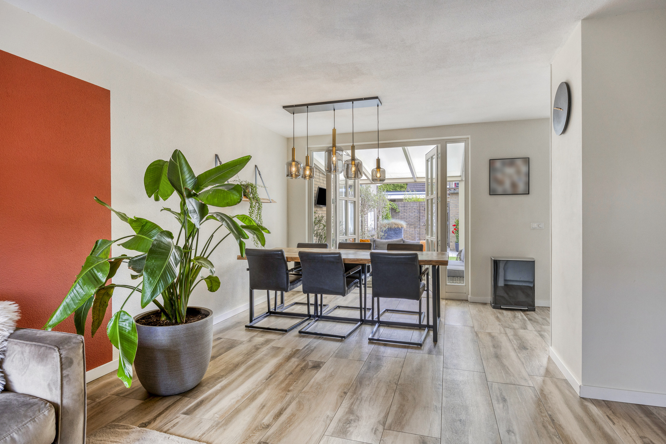 De lichte woonkamer biedt een prettig zicht op zowel de voor- als achtertuin en is ingedeeld in een gezellige zit- en eethoek. Een voorraadkast onder de trap zorgt voor extra bergruimte. Via openslaande deuren (2019) bereik je het overdekte terras en de tuin.