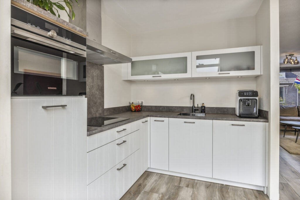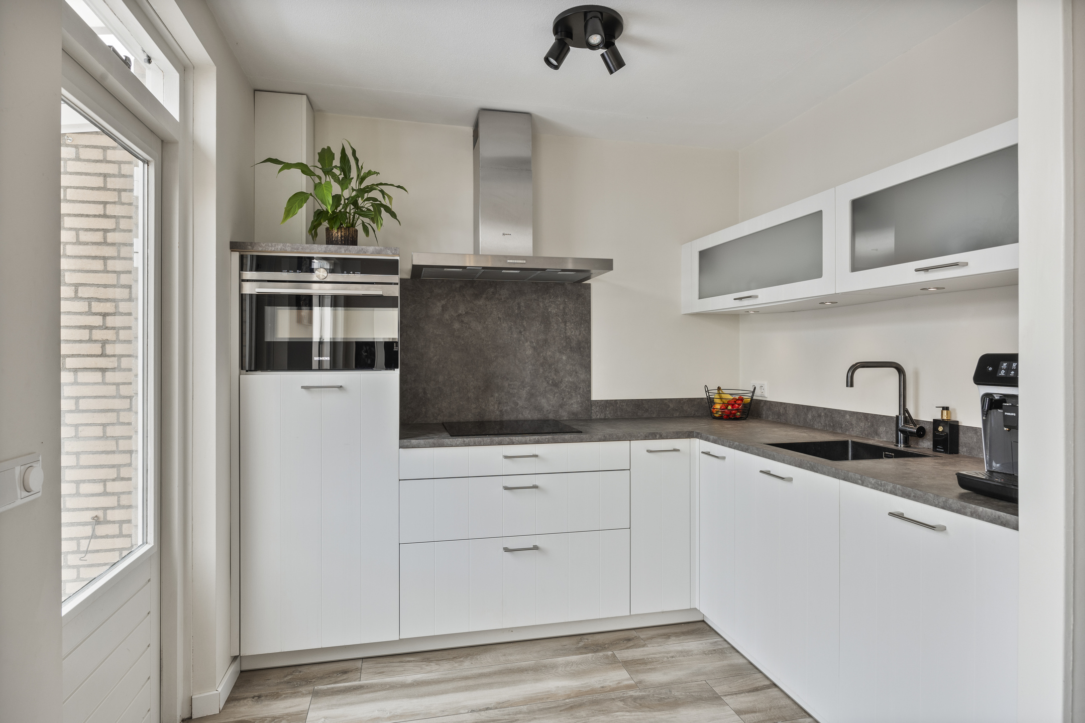 De open keuken (vernieuwd in 2019) in hoekopstelling is uitgerust met diverse inbouwapparatuur: een 4-pits inductiekookplaat, RVS recirculatiekap, koelkast, combi-oven/magnetron (2025) en vaatwasser. Vanuit de keuken heb je ook direct toegang tot het terras.