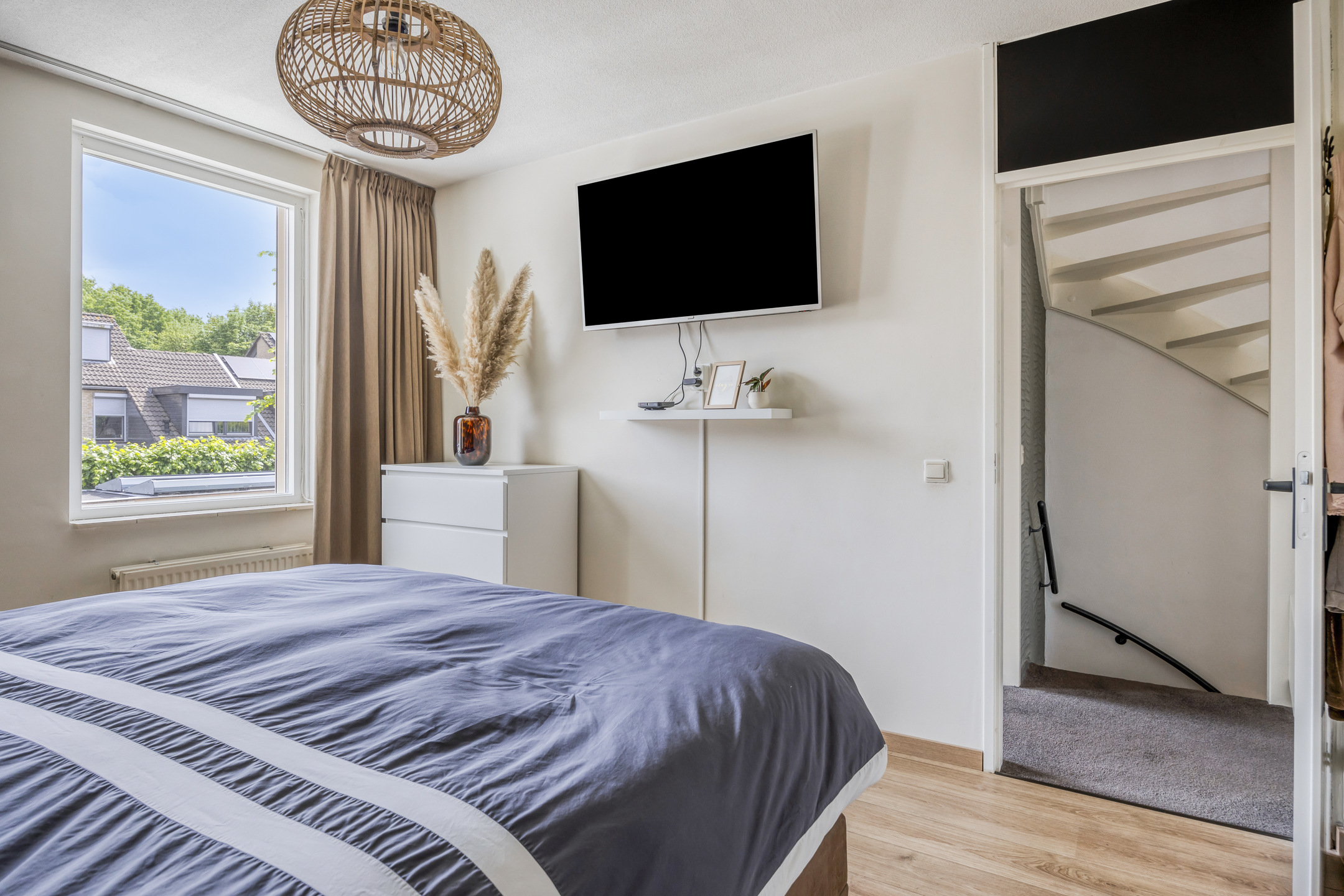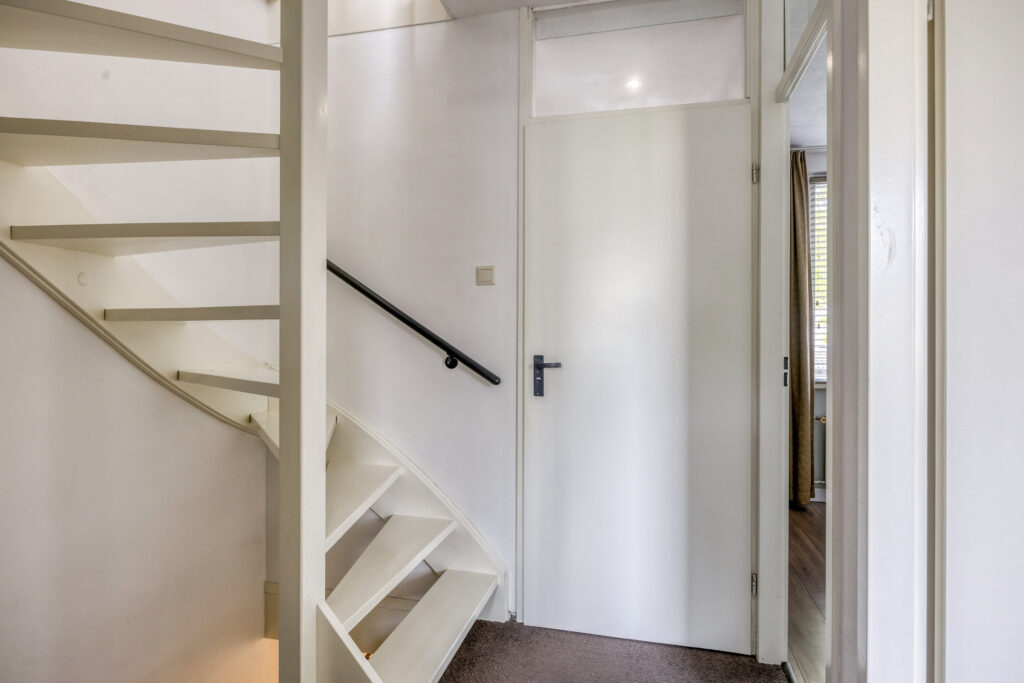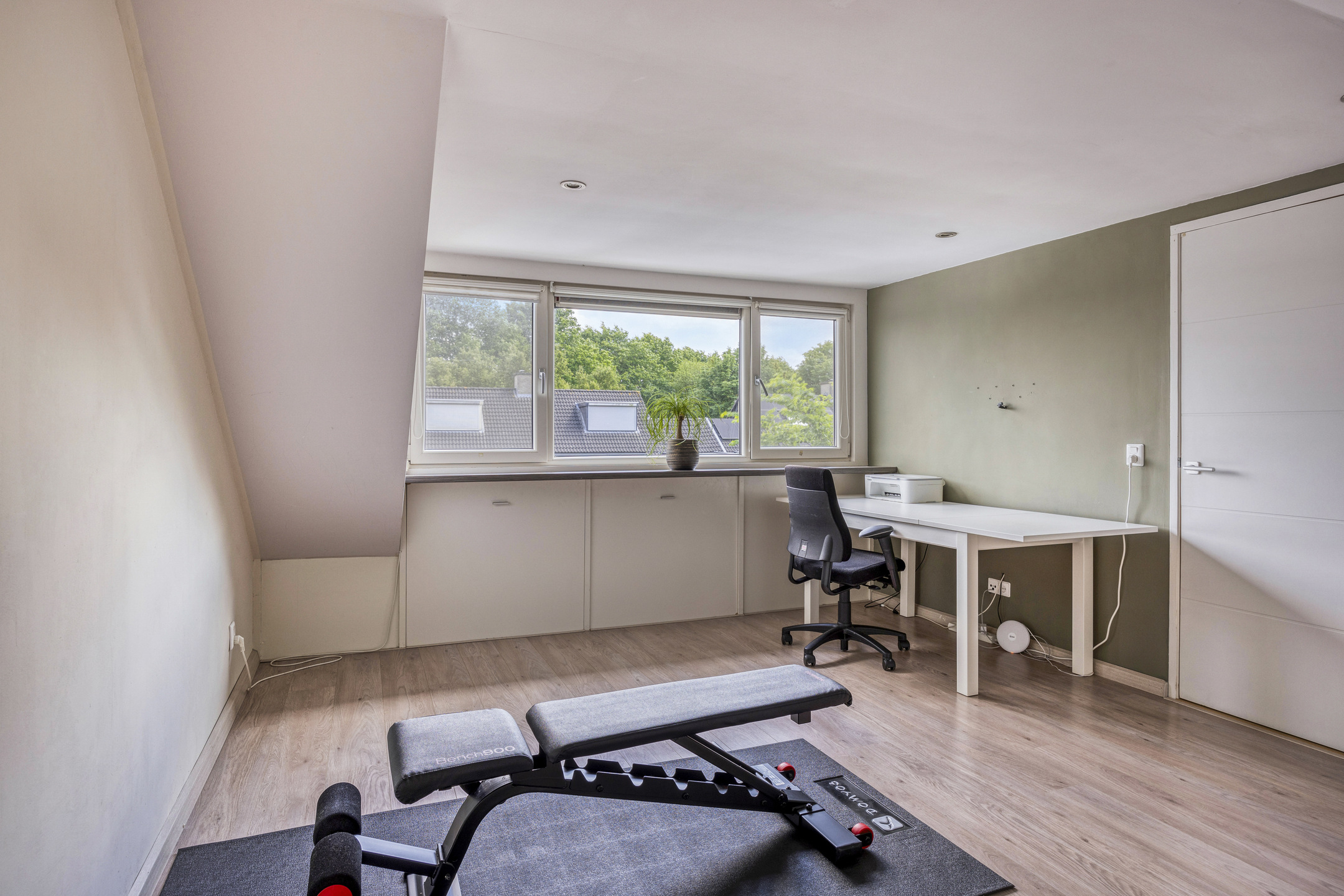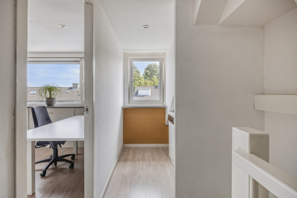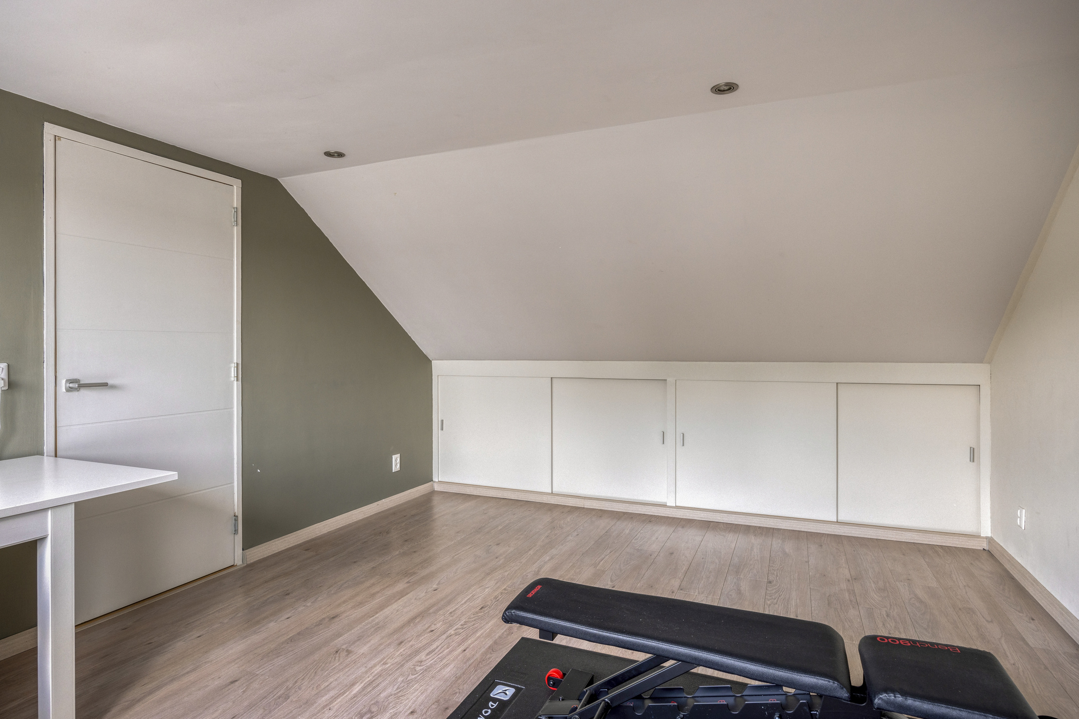 Via een vaste trap kom je op de zolderverdieping met voorzolder, waar zich de wasmachineaansluiting, cv-opstelling (2020) en airco-unit (2023) bevinden. Ook is er een kunststof venster met elektrisch rolluik.