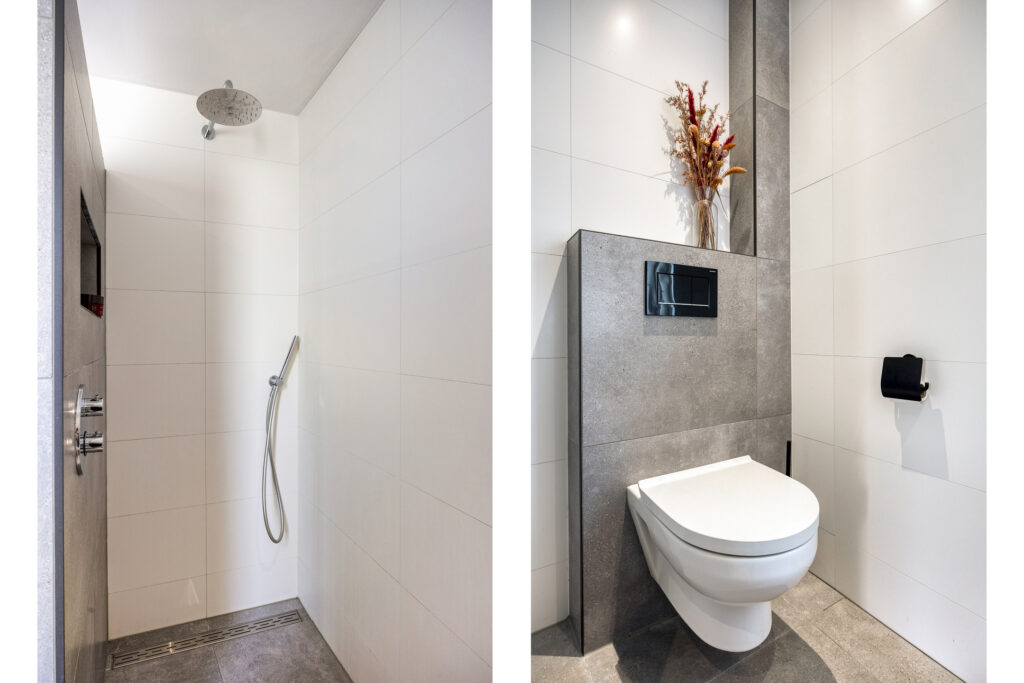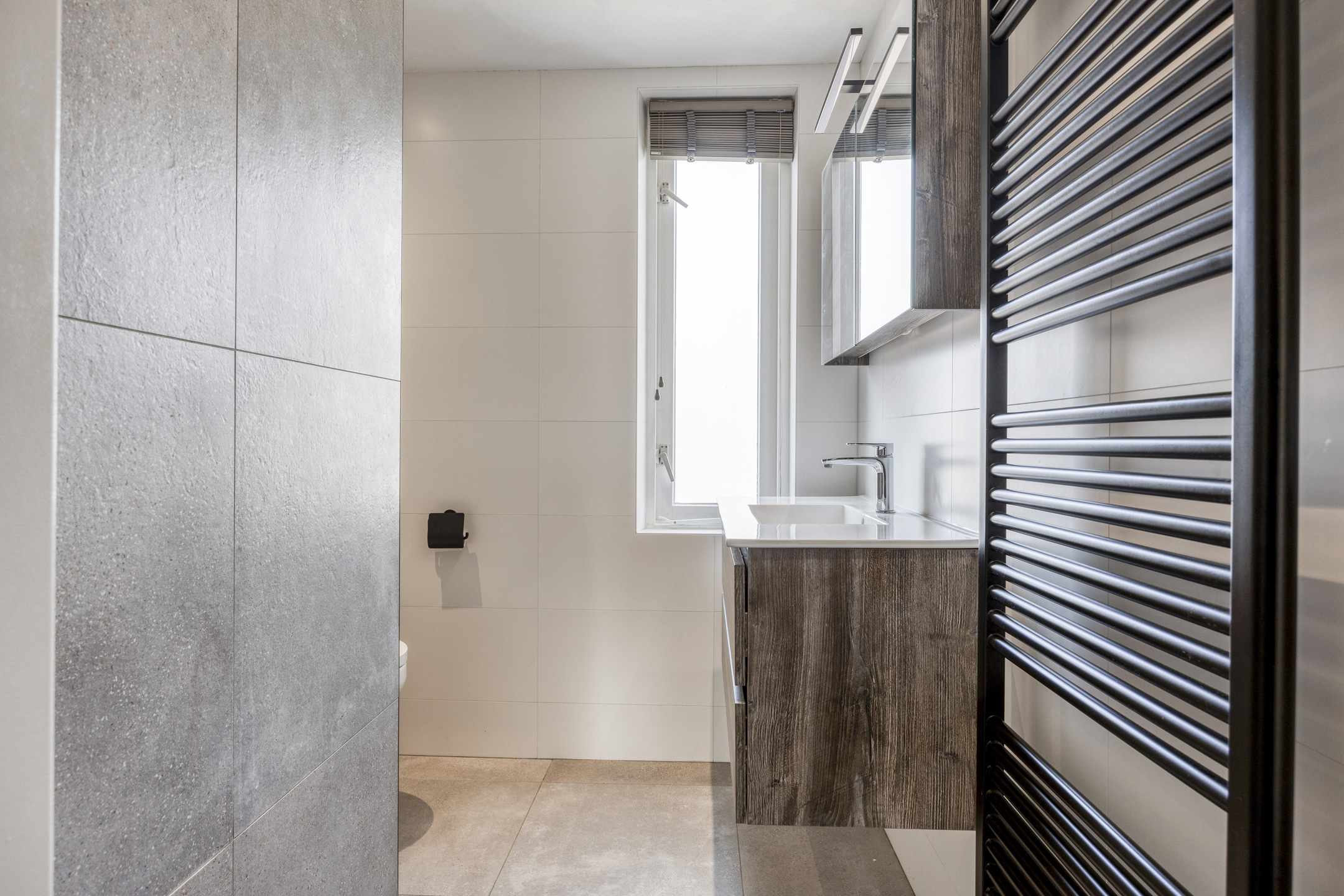 De luxe badkamer (2019) is volledig betegeld en uitgerust met een inloopdouche, wastafelmeubel, vrij hangend toilet, designradiator en inbouwverlichting.