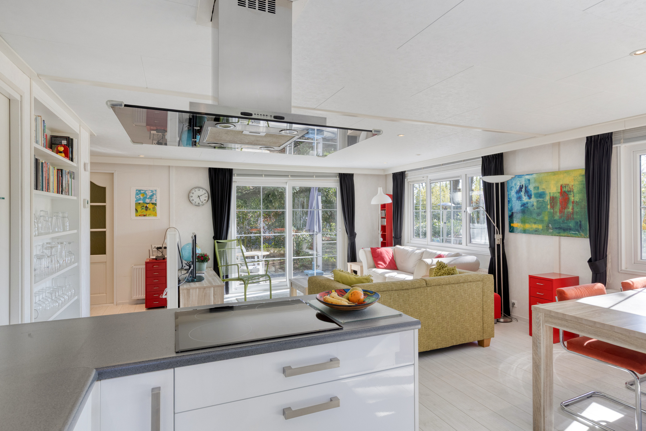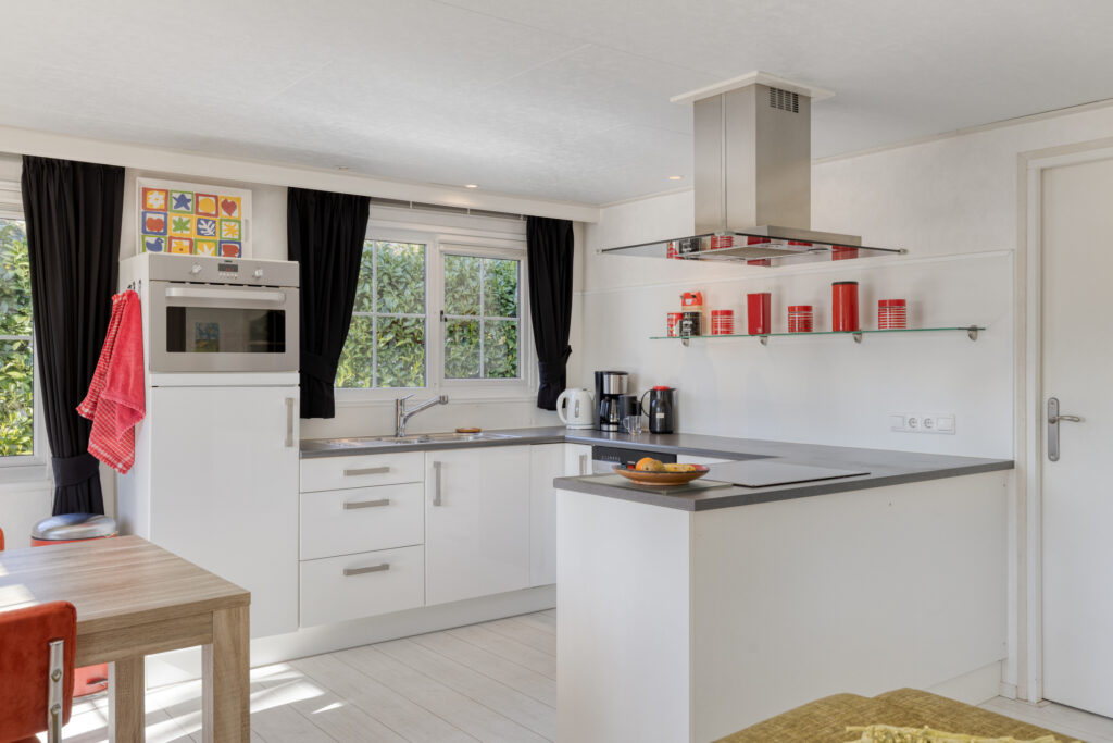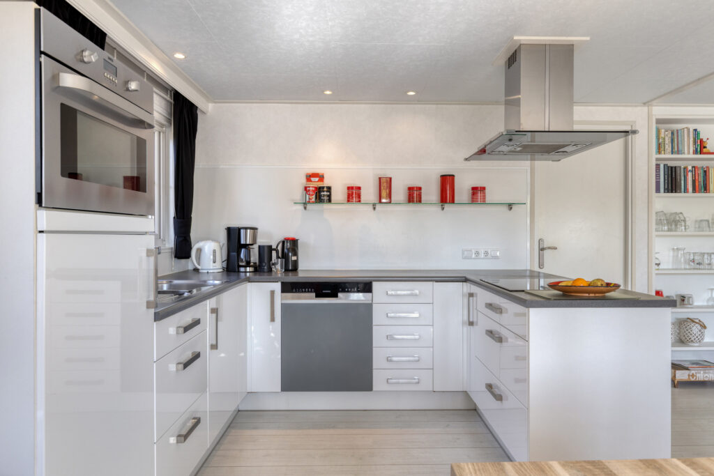 De open keuken met keukeninrichting in hoekopstelling herbergt de volgende apparatuur: 4-pits inductie kookplaat, afzuigkap, koelkast, 1 ¼ RVS spoelbak en vaatwasser (2022).