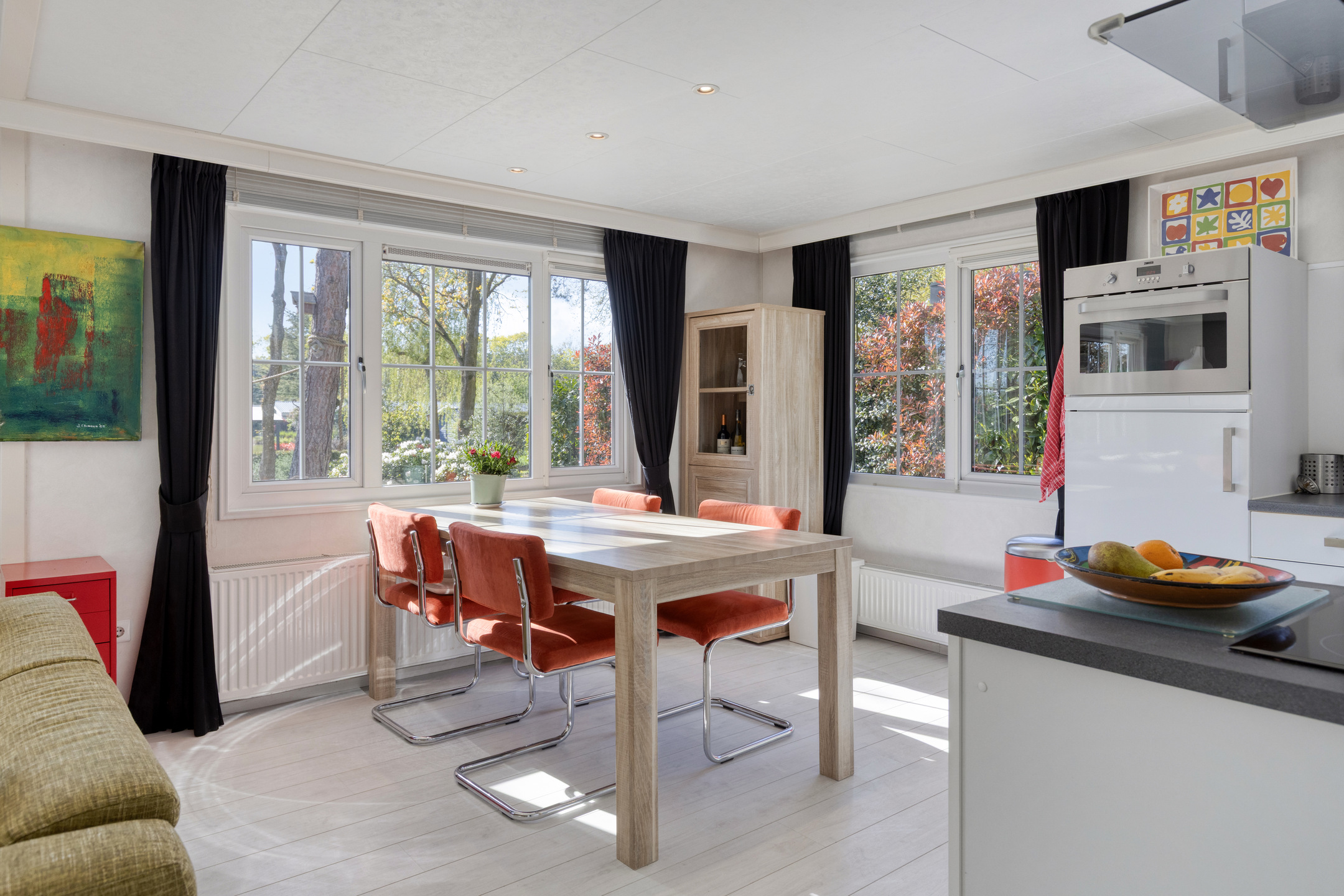 De woonkamer is heerlijk licht met mooi uitzicht door grote raampartijen aan drie kanten. Bij het zitgedeelte is een grote schuifdeur die de kamer met terras en tuin verbindt. Vanaf de eettafel heeft u vanaf het ontbijt tot het avondeten zicht op de vele vogels die de tuin bevolken, waaronder boomklevers, koolmeesjes, roodborstjes, merels en de bonte specht. Ook eekhoorntjes maken gebruik van de tuin en het bos er direct achter.
