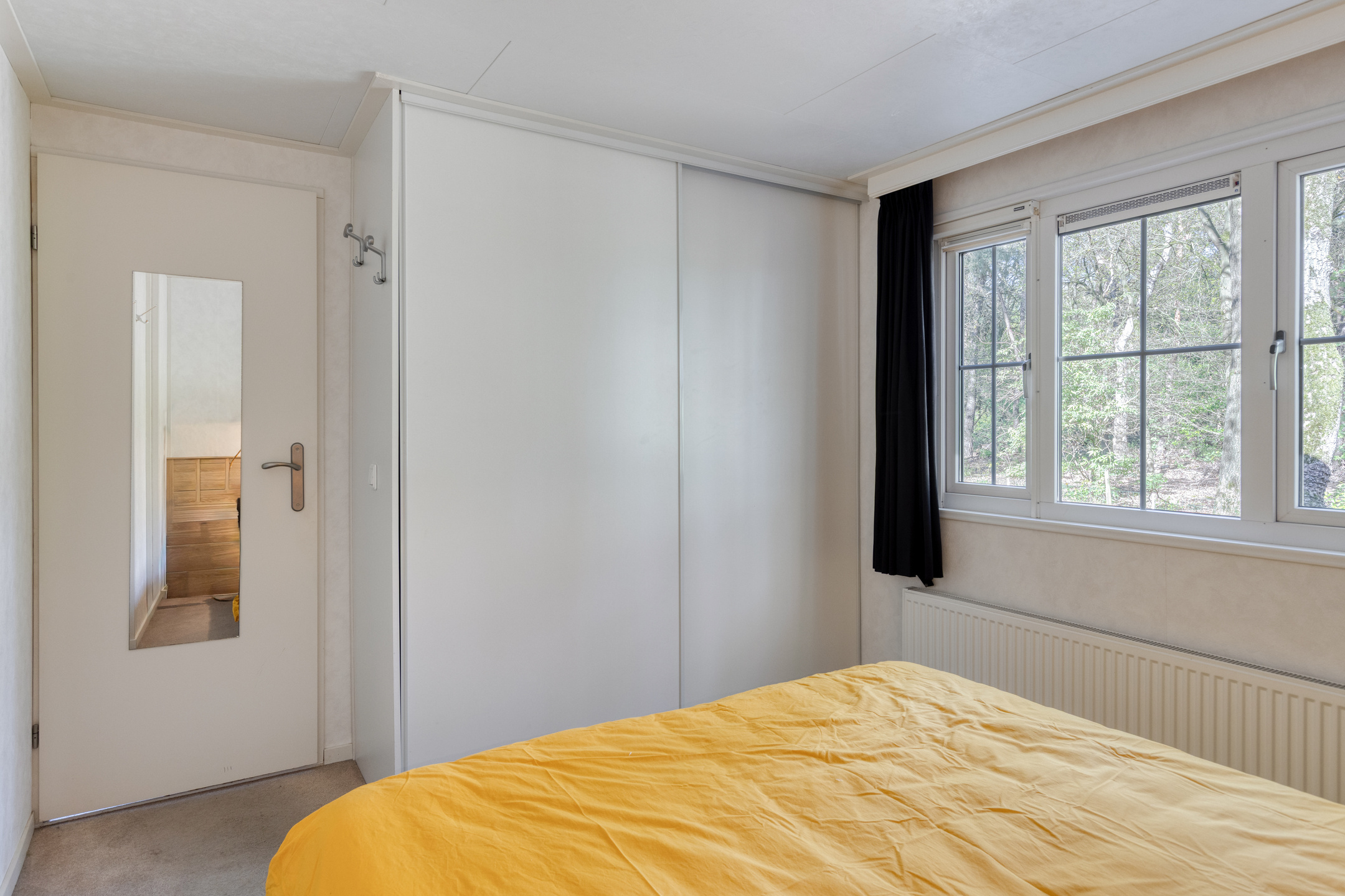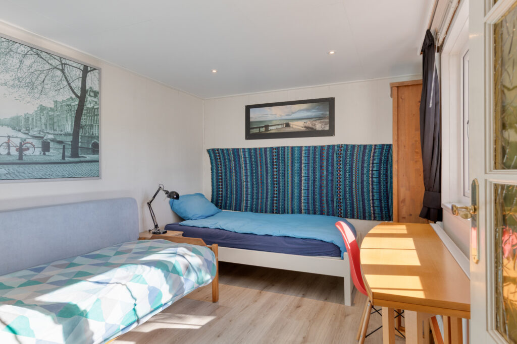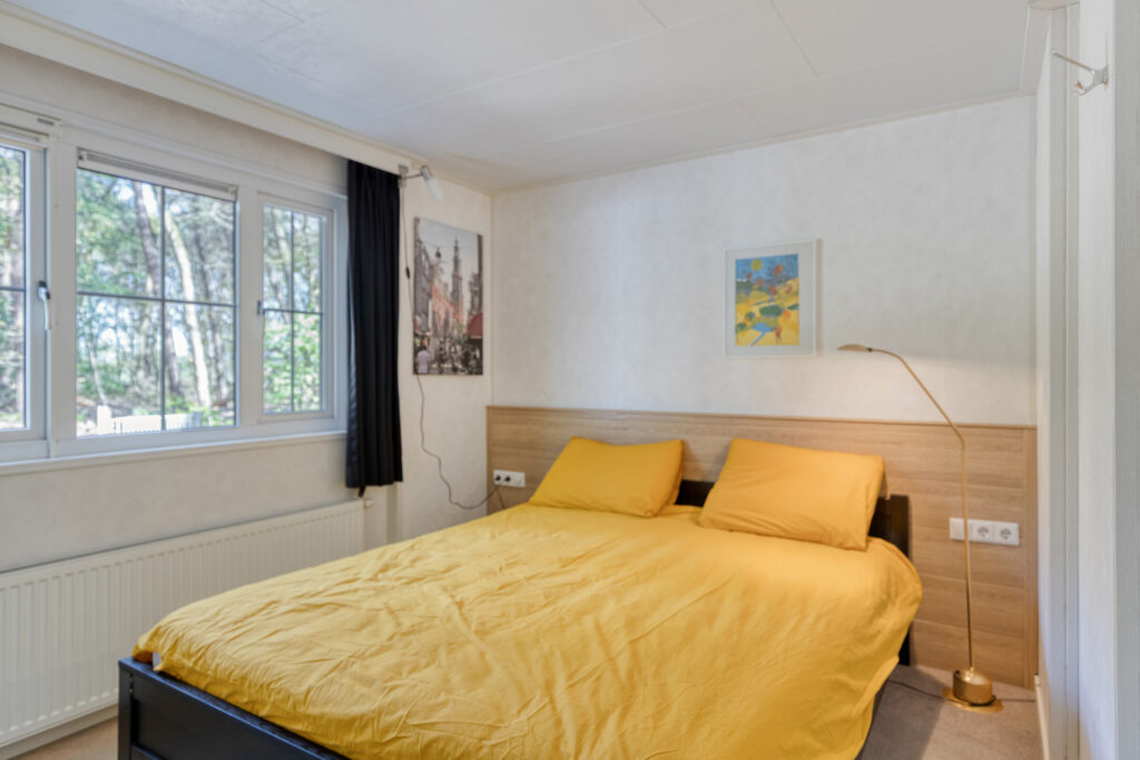 De grote slaapkamer bevindt zich aan de achterzijde van het chalet, met uitzicht op het bos en ochtendzon en beschikt over een ruime schuifkastenwand. De kleinste slaapkamer annex werkkamertje bevindt zich eveneens aan de achterzijde. Slaapkamer 3 is bereikbaar vanuit de woonkamer, heeft zicht op terras en tuin en biedt ruimte voor een tweepersoonsbed of twee eenpersoonsbedden.