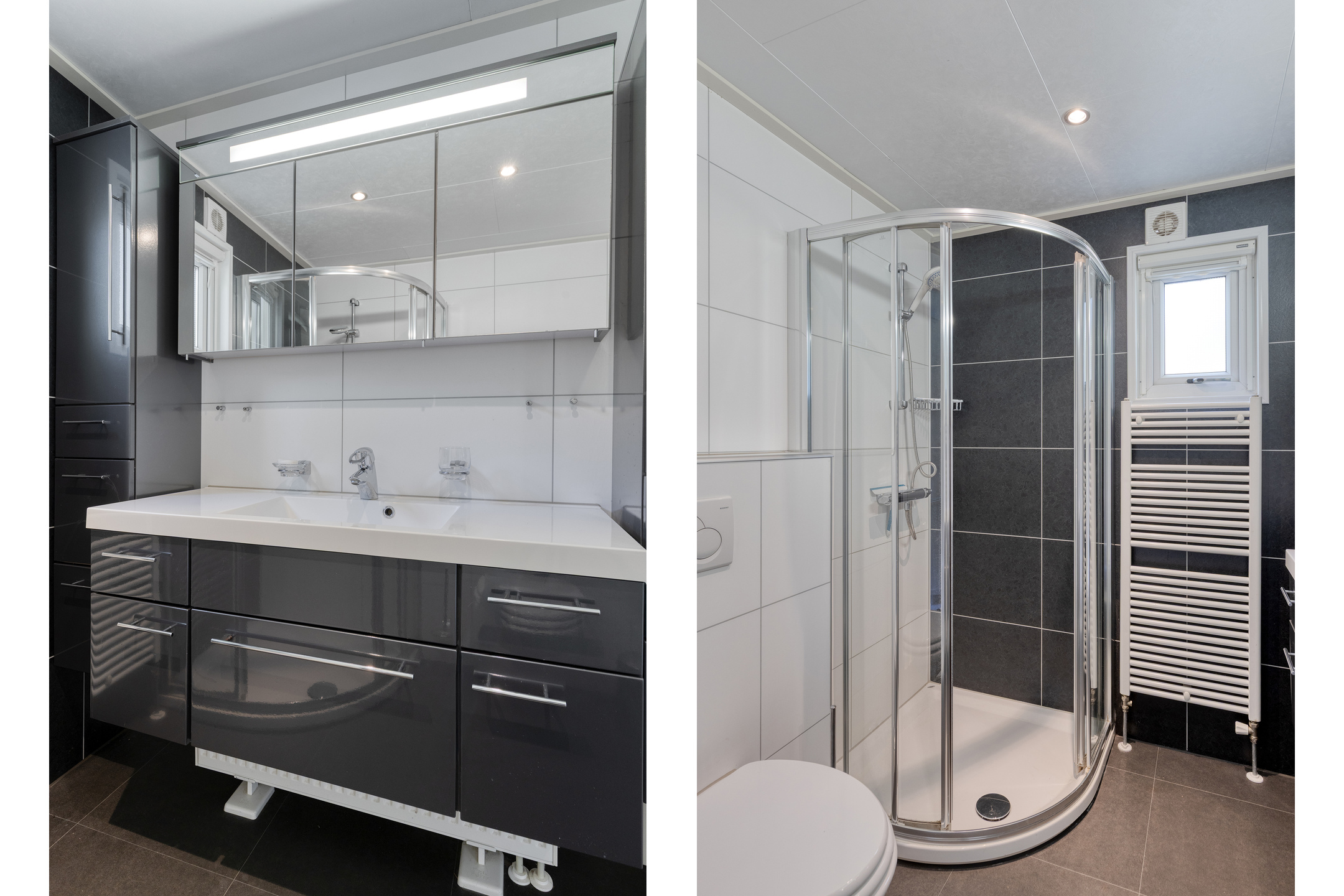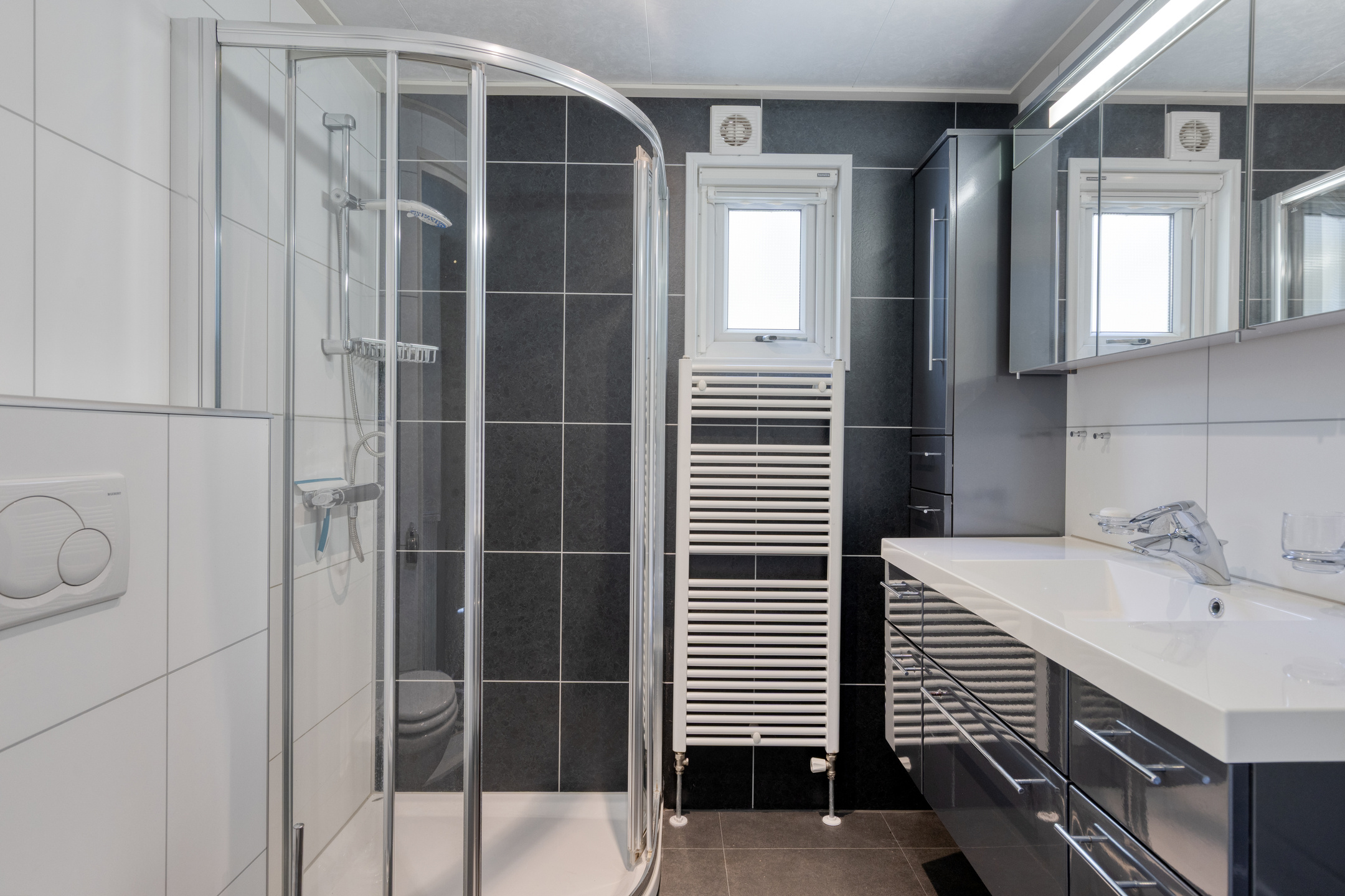 De moderne badkamer heeft een wastafelmeubel met veel opbergruimte en spiegels, douchecabine, wandcloset en mechanische ventilatie.