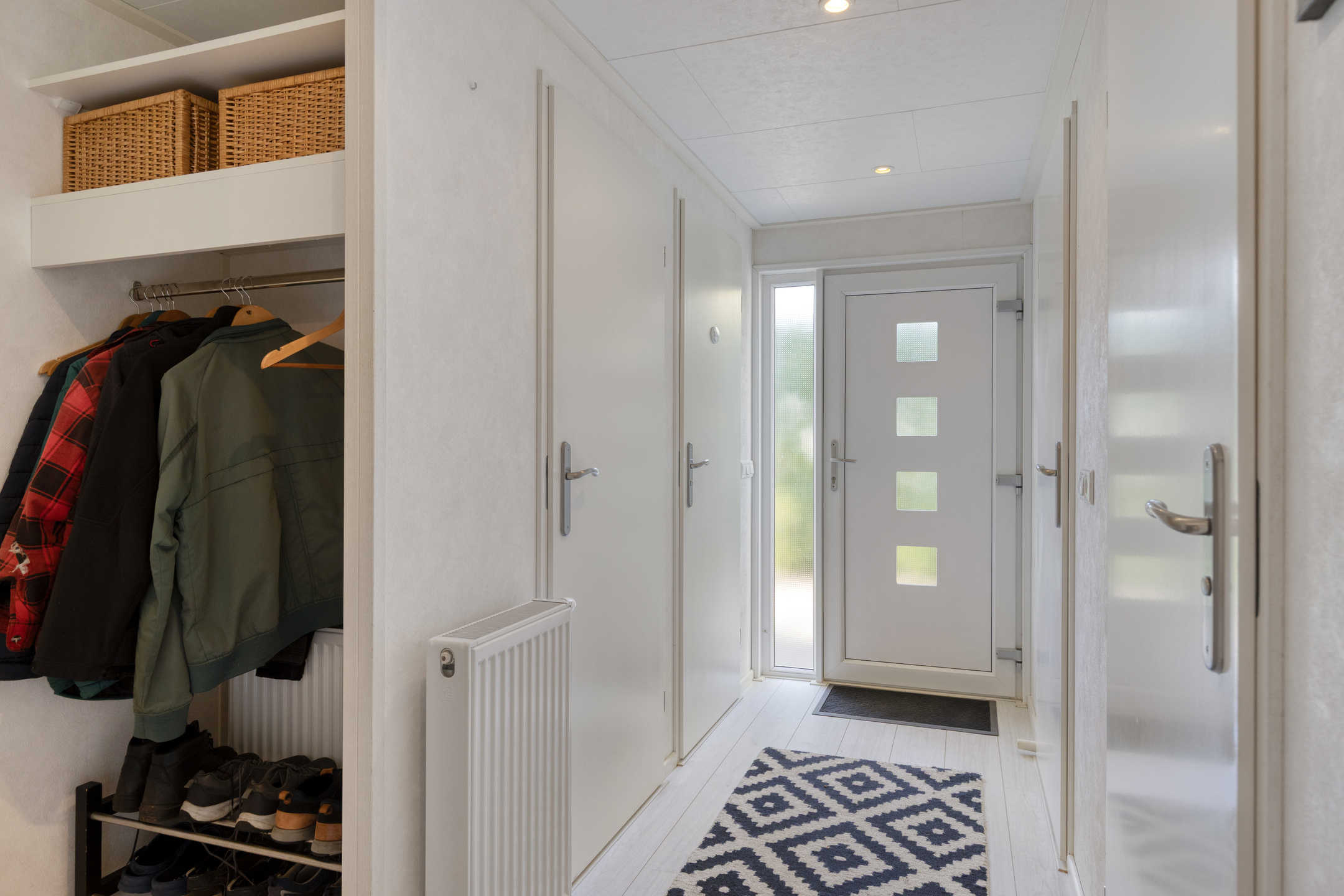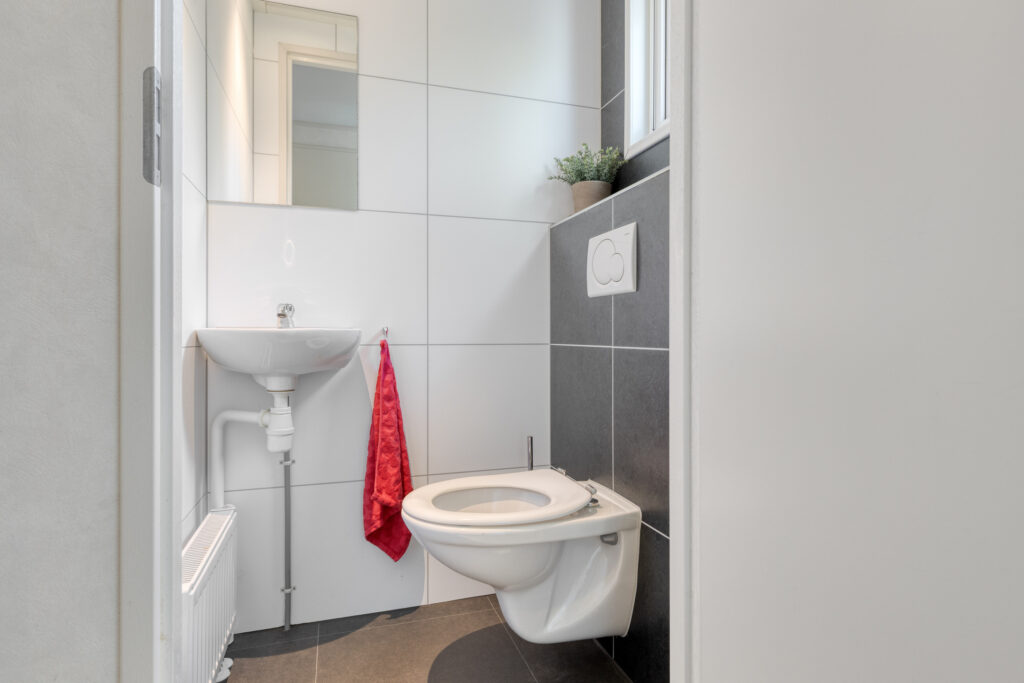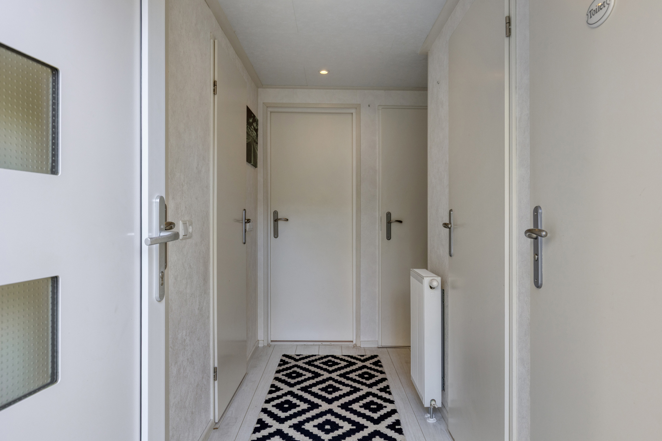 Entree. Hal met garderobe en laminaat vloer. Geheel betegeld modern toilet met wandcloset en fonteintje. Vaste inbouwkast met aansluitingen voor de wasapparatuur. Tweede vaste inbouwkast met CV.